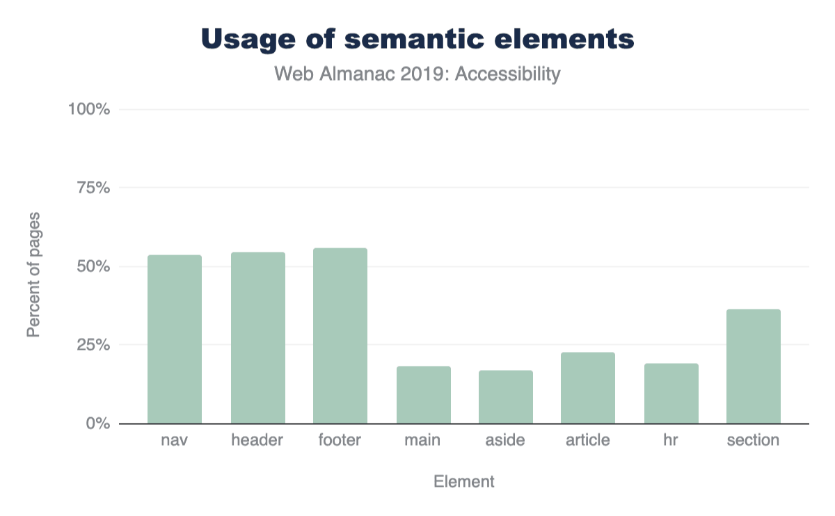 Others like <article>, <hr>, and <aside> aid readers in understanding a page’s main content. For example, <article> says where one article ends and another begins. These elements are not used nearly as much, with each sitting at around 20% usage. Not all of these belong on every web page, so this isn’t necessarily an alarming statistic.