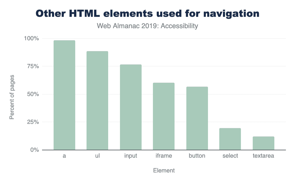 We suspect that some of the most popular web UI frameworks include navigation roles in their templates. This would explain the prevalence of landmark attributes. If this theory is correct, updating popular UI frameworks to include more accessibility support may have a huge impact on the accessibility of the web.