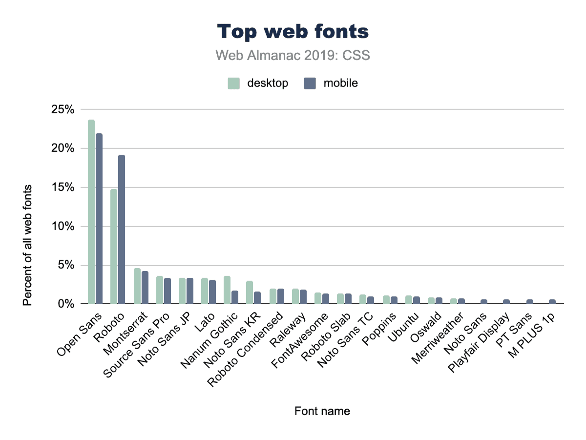 It’s also interesting to note the differences between desktop and mobile adoption. For example, mobile pages use Open Sans slightly less often than desktop. Meanwhile, they also use Roboto slightly more often.