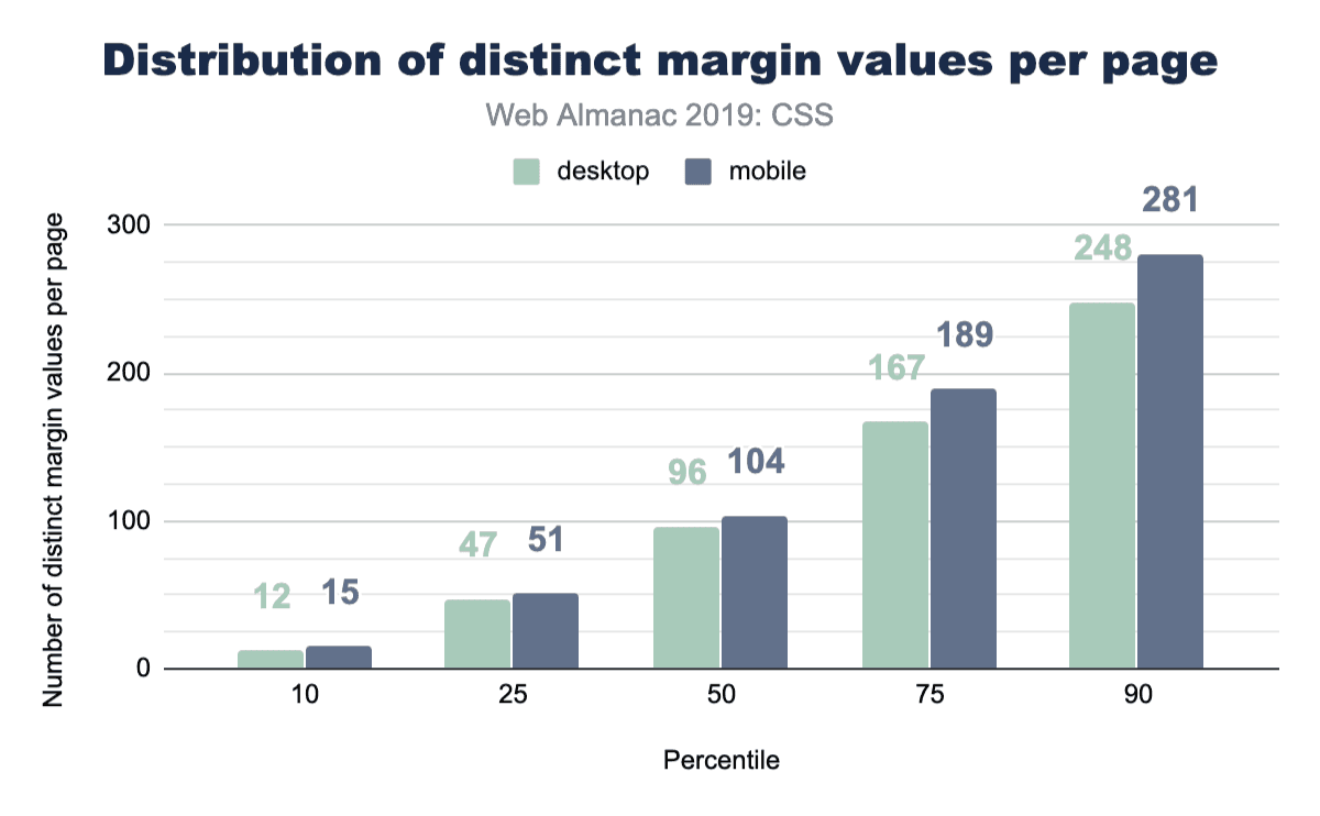 Quite a lot, it seems! The median desktop page has 96 distinct margin values and 104 on mobile. That makes for a lot of unique spacing moments in your design. Curious how many margins you have in your site? How can we make all this whitespace more manageable?