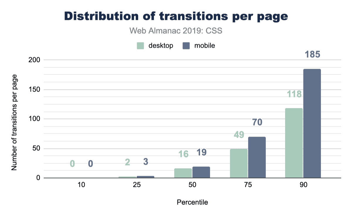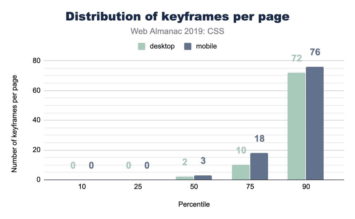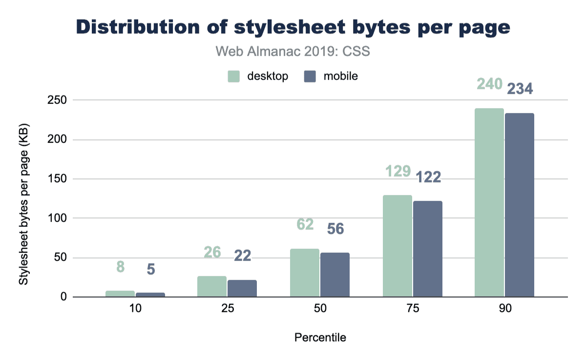 This is a fun one, because if you asked a user how many font sizes they feel are on a page, they’d generally return a number of 5 or definitely less than 10. Is that reality though? Even in a design system, how many font sizes are there? We queried the web and found the median to be 40 on mobile and 38 on desktop. Might be time to really think hard about custom properties or creating some reusable classes to help you distribute your type ramp.