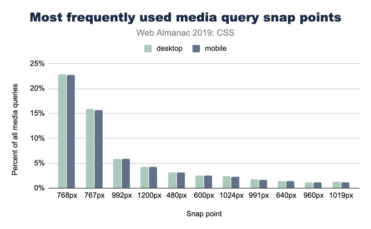 Interestingly, portrait isn’t used very much, whereas landscape is used much more. We can only assume that 768px has been reliable enough as the portrait layout case that it’s reached for much less. We also assume that folks on a desktop computer, testing their work, can’t trigger portrait to see their mobile layout as easily as they can just squish the browser. Hard to tell, but the data is fascinating.