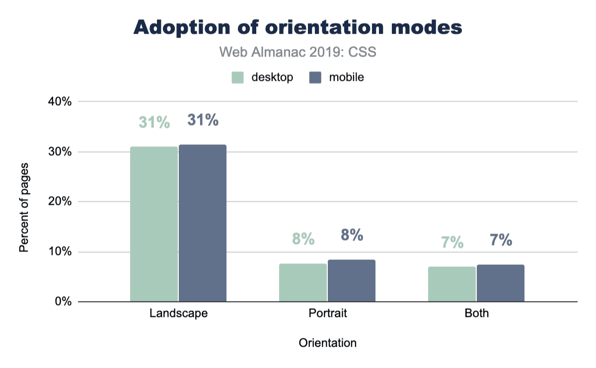 The most popular query value from the popular breakpoint sizes looks to be 768px, which made us curious. Was this value primarily used to switch to a portrait layout, since it could be based on an assumption that 768px represents the typical mobile portrait viewport? So we ran a follow up query to see the popularity of using the portrait and landscape modes: