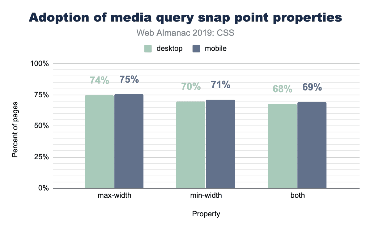 We saw larger differences in unit types when it comes to mobile and desktop usage for viewport-based units. 36.8% of mobile sites use vh (viewport height), while only 31% of desktop sites do. We also found that vh is more common than vw (viewport width) by about 11%. vmin (viewport minimum) is more popular than vmax (viewport maximum), with about 8% usage of vmin on mobile while vmax is only used by 1% of websites.