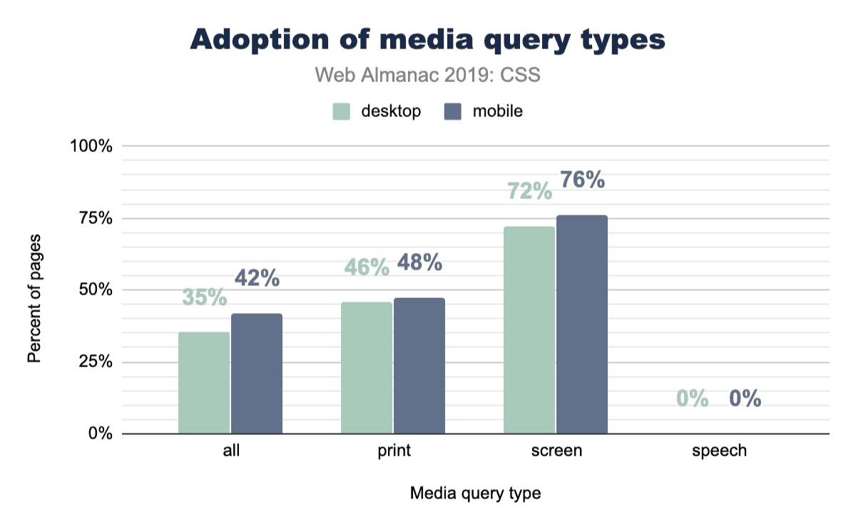 Figure 2.32. Adoption of the all, print, screen, and speech types of media queries.