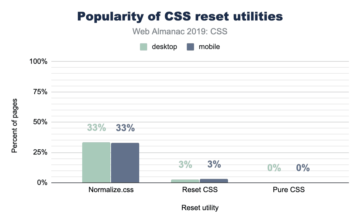 Turns out that about one-third of the web is using normalize.css, which could be considered a more gentle approach to the task then a reset is. We looked a little deeper, and it turns out that Bootstrap includes normalize.css, which likely accounts for a massive amount of its usage. It’s worth noting as well that normalize.css has more adoption than Bootstrap, so there are plenty of folks using it on its own.