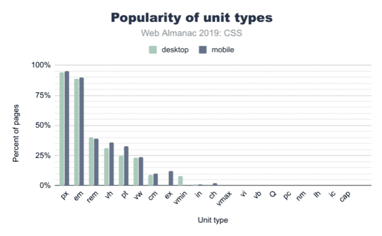 Unsurprisingly, in Figure 2.5 above, px is the most used unit type, with about 95% of web pages using pixels in some form or another (this could be element sizing, font size, and so on). However, the em unit is almost as popular, with about 90% usage. This is over 2x more popular than the rem unit, which has only 40% frequency in web pages. If you’re wondering what the difference is, em is based on the parent font size, while rem is based on the base font size set to the page. It doesn’t change per-component like em could, and thus allows for adjustment of all spacing evenly.