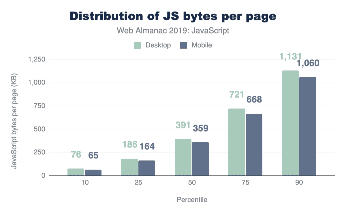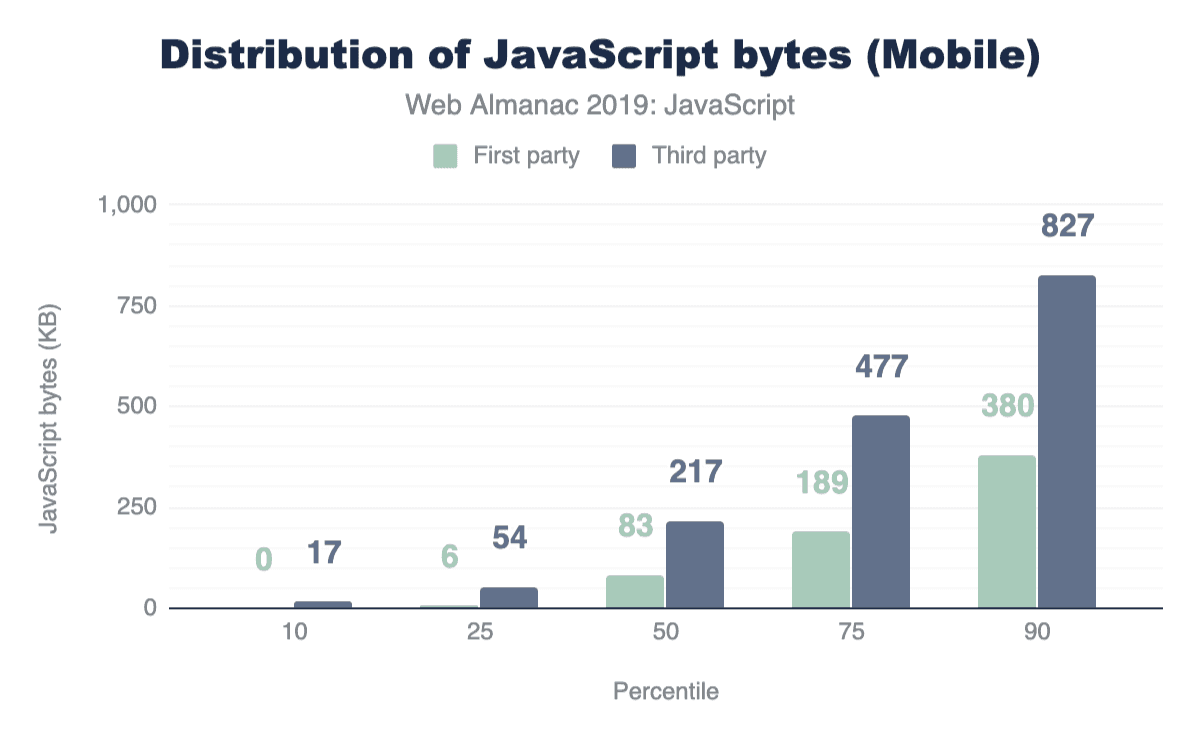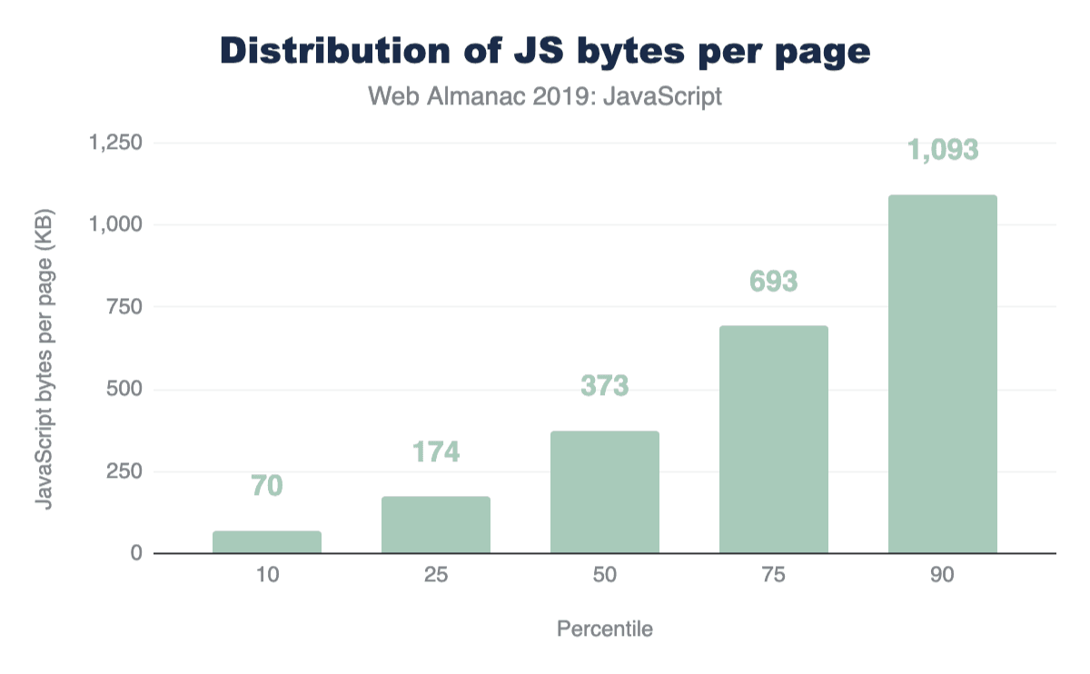 Figure 1.1 above shows that we use 373 KB of JavaScript at the 50th percentile, or median. In other words, 50% of all sites ship more than this much JavaScript to their users.