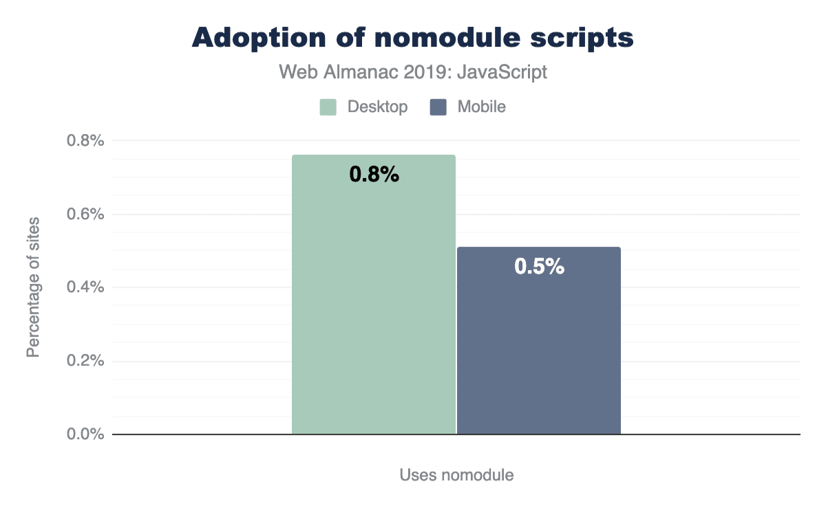 Similarly, very few sites (0.50%-0.80%) use the nomodule attribute for any scripts.