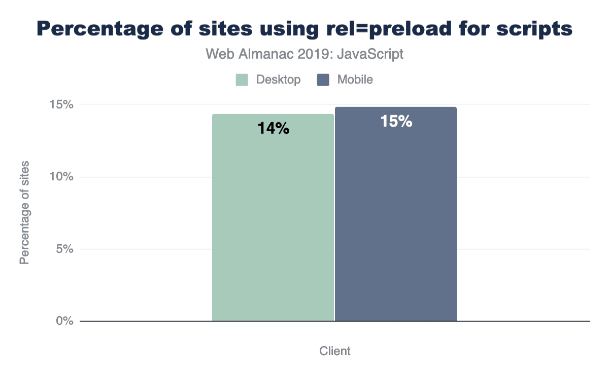 For all sites measured in HTTP Archive, 14.33% of desktop sites and 14.84% of mobile sites use <link rel="preload"> for scripts on their page.