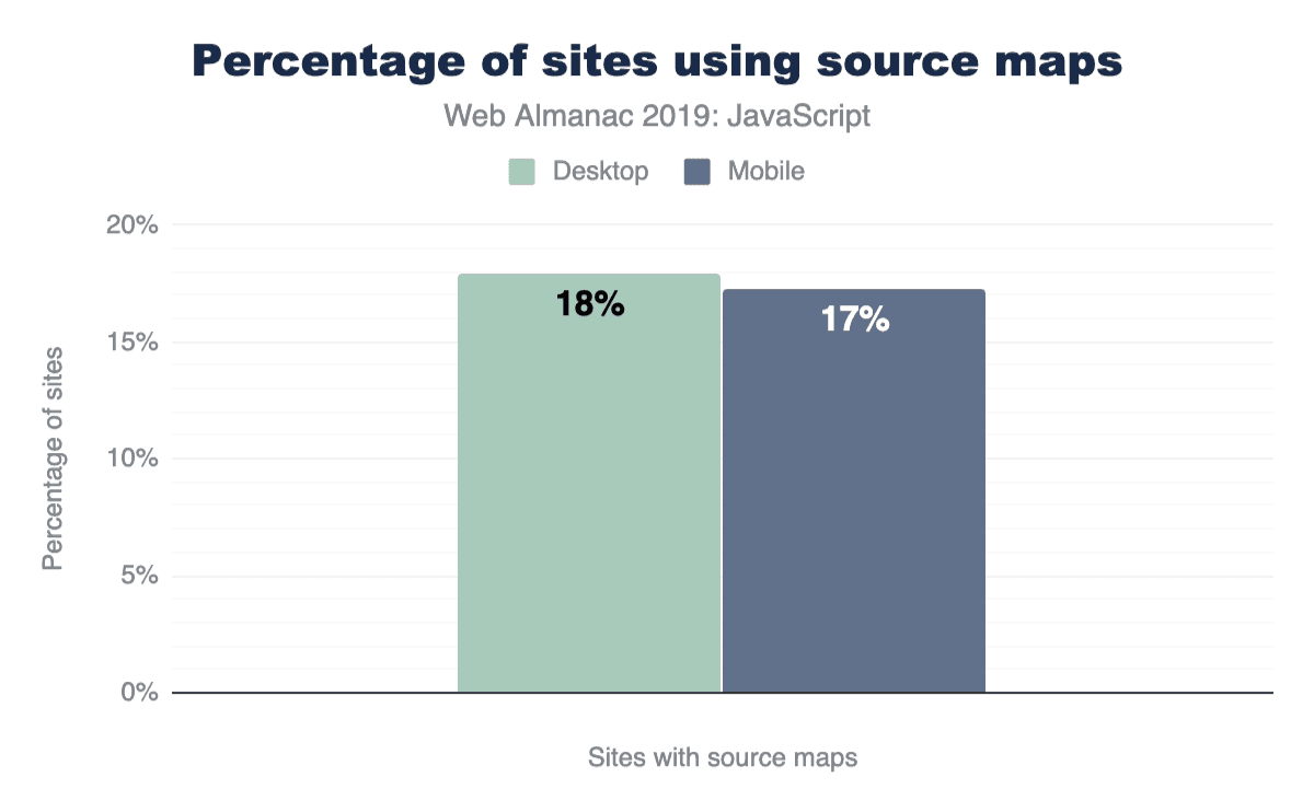 For both desktop and mobile pages, the results are about the same. 17-18% include a source map for at least one script on the page (detected as a first-party script with sourceMappingURL).
