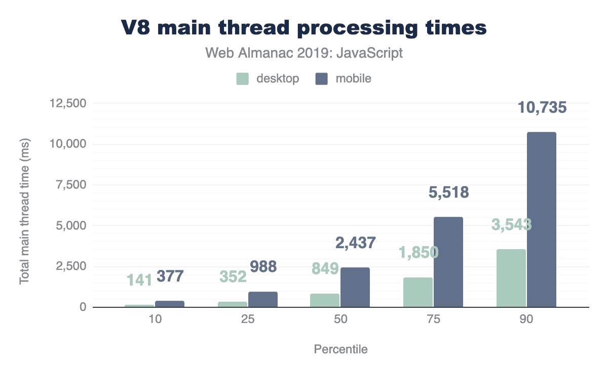 After being parsed and compiled, JavaScript fetched by the browser needs to processed (or executed) before it can be utilized. Devices vary, and their computing power can significantly affect how fast JavaScript can be processed on a page. What are the current processing times on the web?