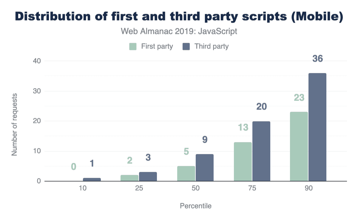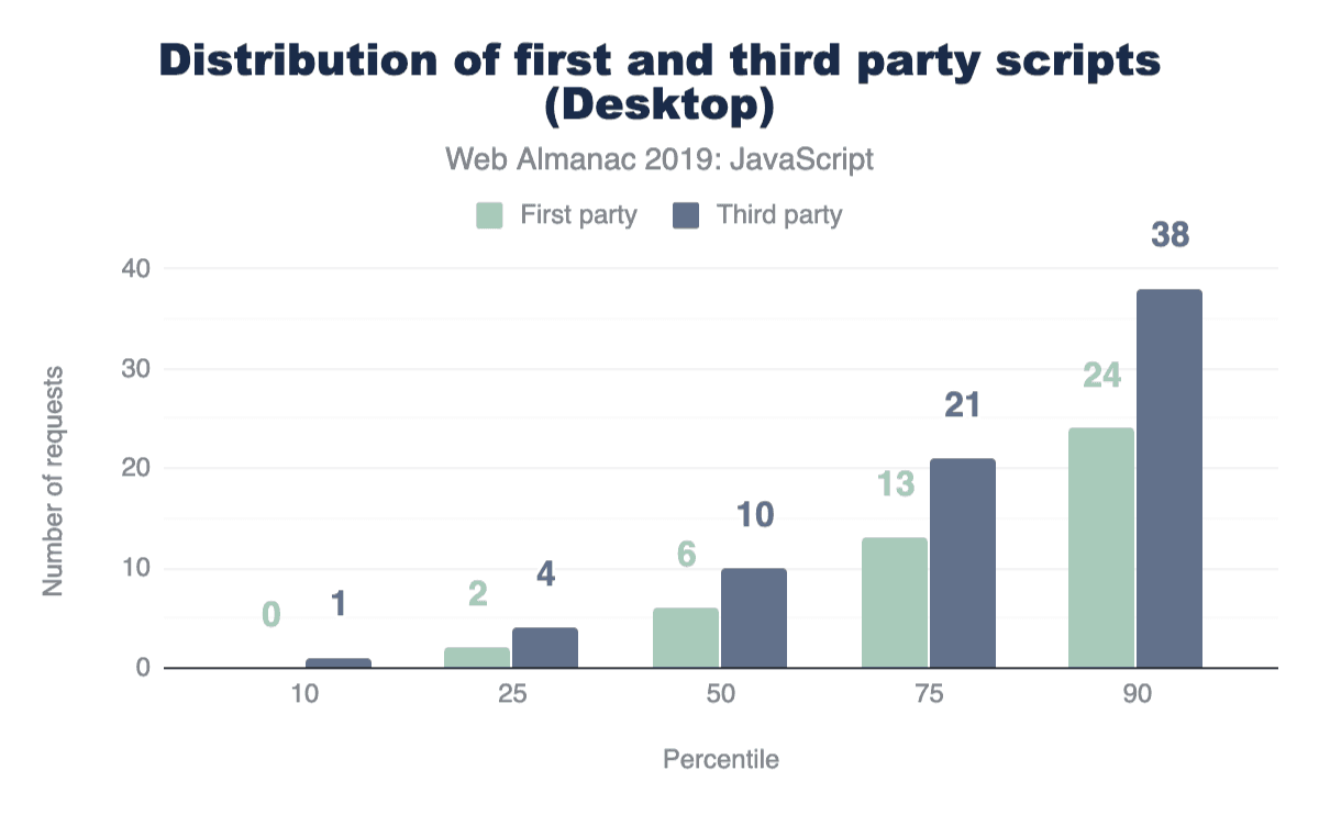 Third-party JavaScript can come from any external, third-party source. Ads, analytics and social media embeds are all common use-cases for fetching third-party scripts. So naturally, this brings us to our next question: how many requests sent are third-party instead of first-party?