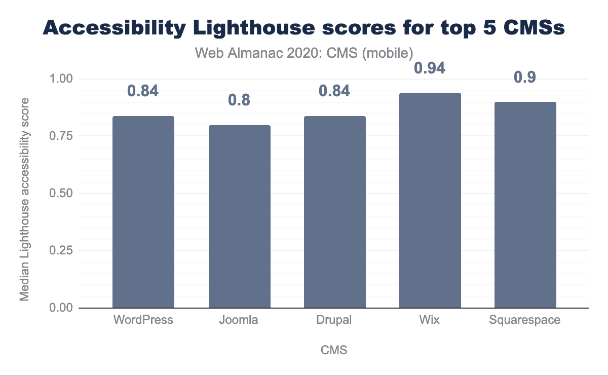 The bar should be higher here, though. An average score of 0.78 across all CMSs still leaves significant room for improvement, and the maximum score of 0.98 shows even the “best” CMS for accessibility compliance has room for improvement. Improving accessibility is essential and urgent work.
