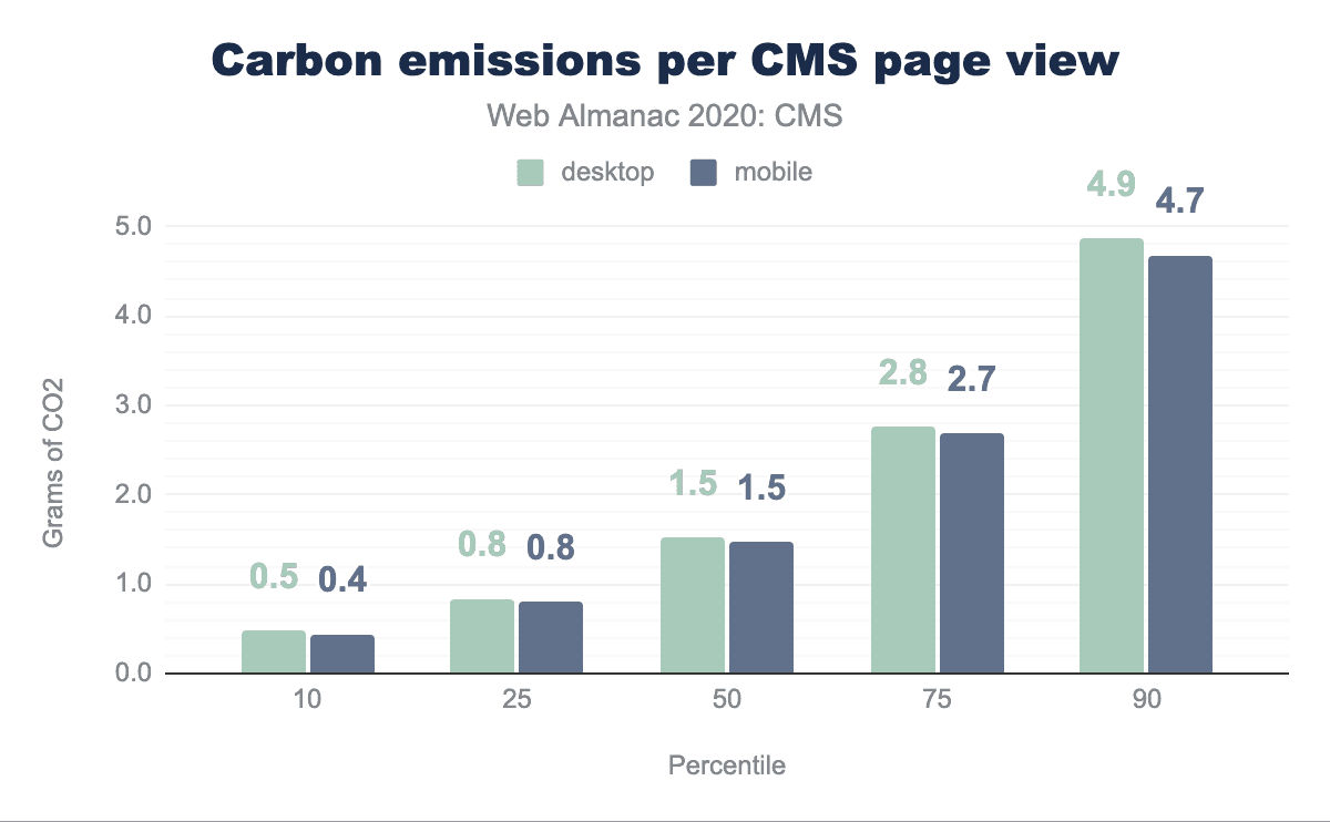 We found that the median CMS page load resulted in the transfer of 2.41 MB and thus the emission of 1.5g of CO2. This was the same for desktop and mobile. The most efficient percentile of CMS web pages result in the generation of at least one third less CO2, whilst the least efficient percentile of CMS web pages goes the other way: over one third less efficient than the median. The most efficient percentile of pages is approximately ten times more efficient than the least efficient percentile.
