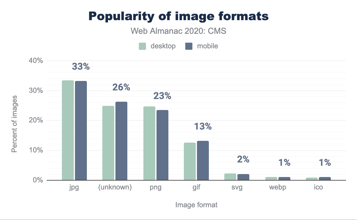Video contributes a larger percentage per resource type here. Making video more efficient, or other mechanisms such as the impact of stopping autoplay, are interesting areas for future research. Here our focus is on images. Popular image formats are JPEG, PNG, GIF, SVG, WebP, and ICO. Of these, WebP is the most efficient in most situations, with WebP lossless images 26% smaller than equivalent PNGs and 25-34% smaller than comparable JPGs. We see, however, that WebP is the second least popular image format across all CMS pages: