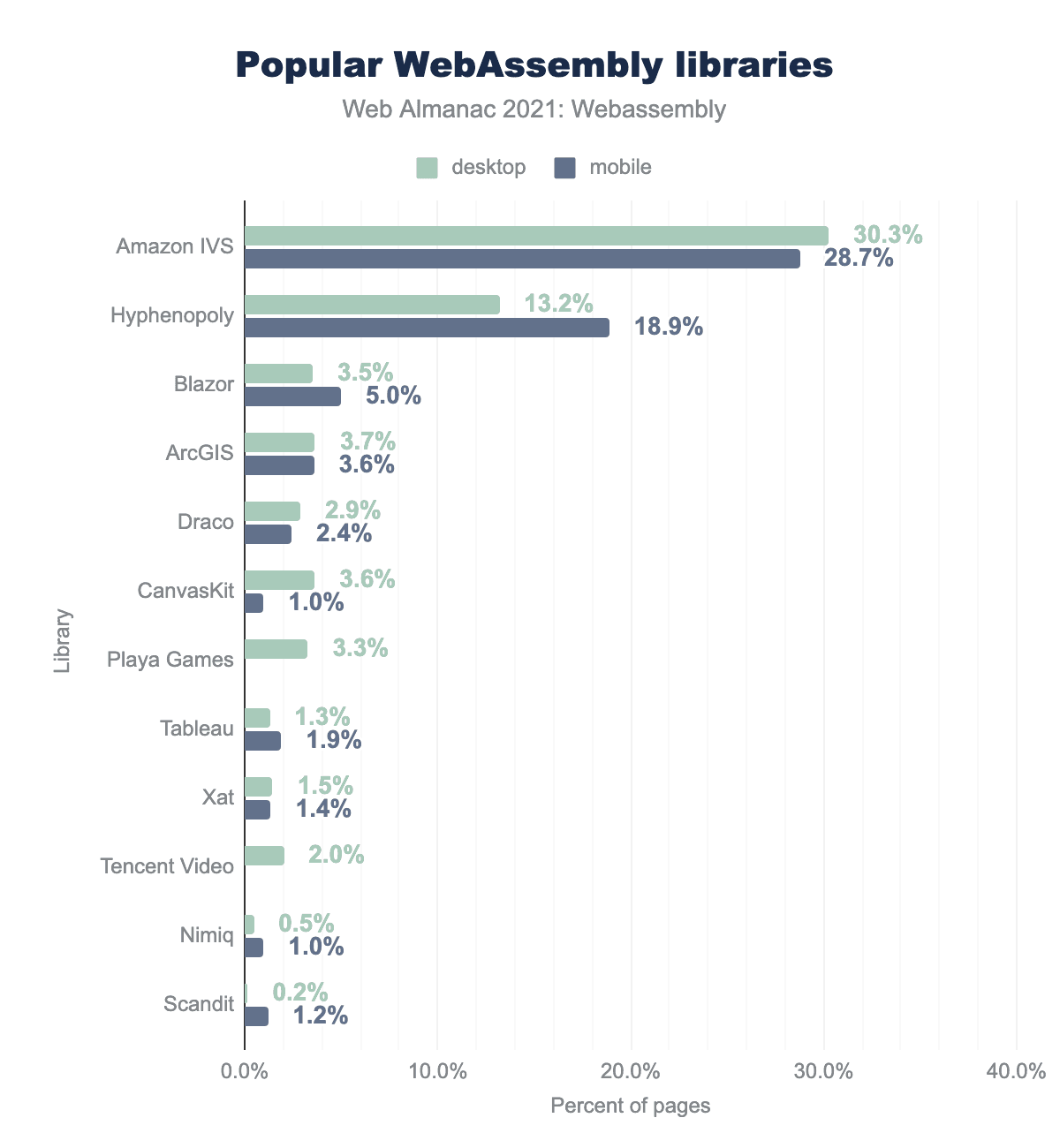 Other libraries from both top 10 desktop and mobile lists account for up to 5% of WebAssembly requests each. Here’s a complete list of libraries shown above, with inferred toolchains and links to corresponding home pages with more information: