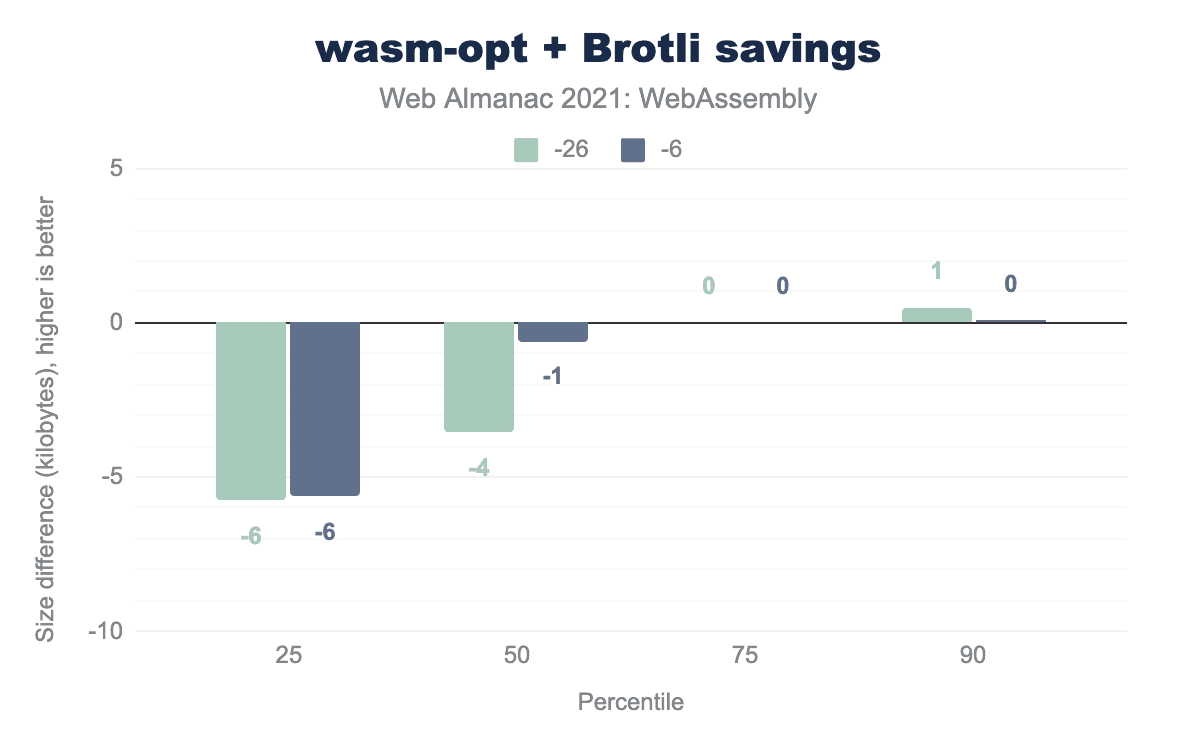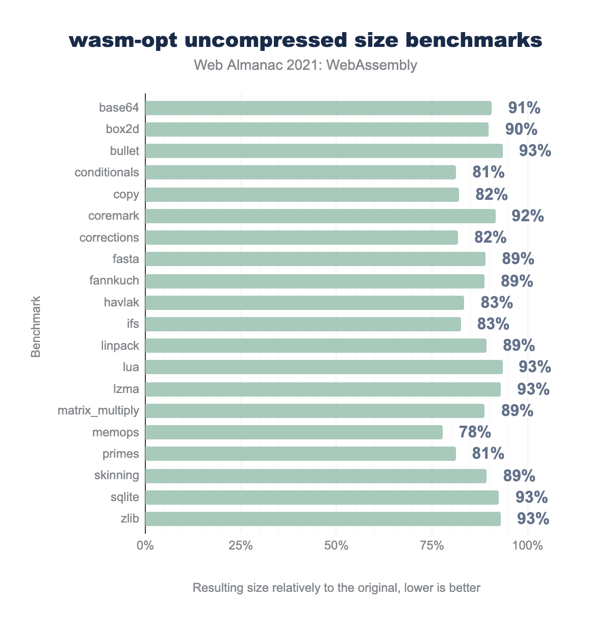 3. As mentioned earlier, the network (compressed) size is not everything. Smaller WebAssembly binaries tend to mean faster compilation in the VM, less memory consumption while compiling, and less memory to hold the compiled code. wasm-opt has to strike a balance here, which might also mean that the compressed size might sometimes regress in favor of better raw sizes.
