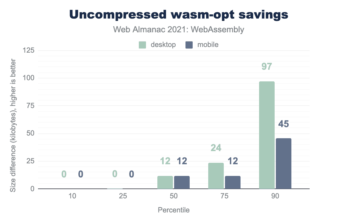 Median savings are around 40 KB. The top 10% save just under 600 KB on desktop and 330 KB on mobile. The largest savings produced reach as much as 35 MB / 21 MB. Those differences speak in favor of enabling Brotli compression whenever possible, at least for WebAssembly content.