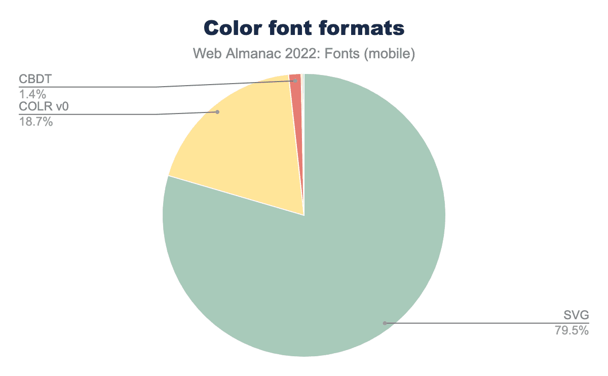Color fonts usage has grown quite a bit since the last Fonts chapter in 2020. Usage went from 0.004% of pages using color fonts in 2020 to about 0.018% in 2022. While those numbers are still very small, there is a clear growth in their usage.