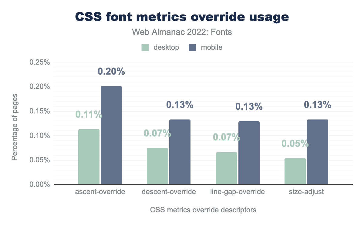 ascent-override is used on 0.11% of desktop and 0.20% mobile pages, descent-override on 0.07% and 0.13% respectively, line-gap-override on 0.07% and 0.13%, and finally size-adjust on 0.05% of desktop and 0.13% of mobile pages.These @font-face descriptors are very new, but are already seeing some use. To make them even more useful developers need two things: