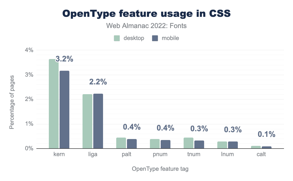 font-feature-settings is used on 13.3% of desktop pages and 12.6% of mobiles pages, and font-variant is used on 3.9% of desktop pages and 3.5% of mobile pages.Overall, usage of OpenType feature usage is quite low on the web. We were hoping most people are using the high-level font-variant properties to enable OpenType features, but their usage is even lower than font-feature-settings. The font-feature-settings property is used on 12.6% of sites, while the font-variant properties are used on only 3.5% of sites.