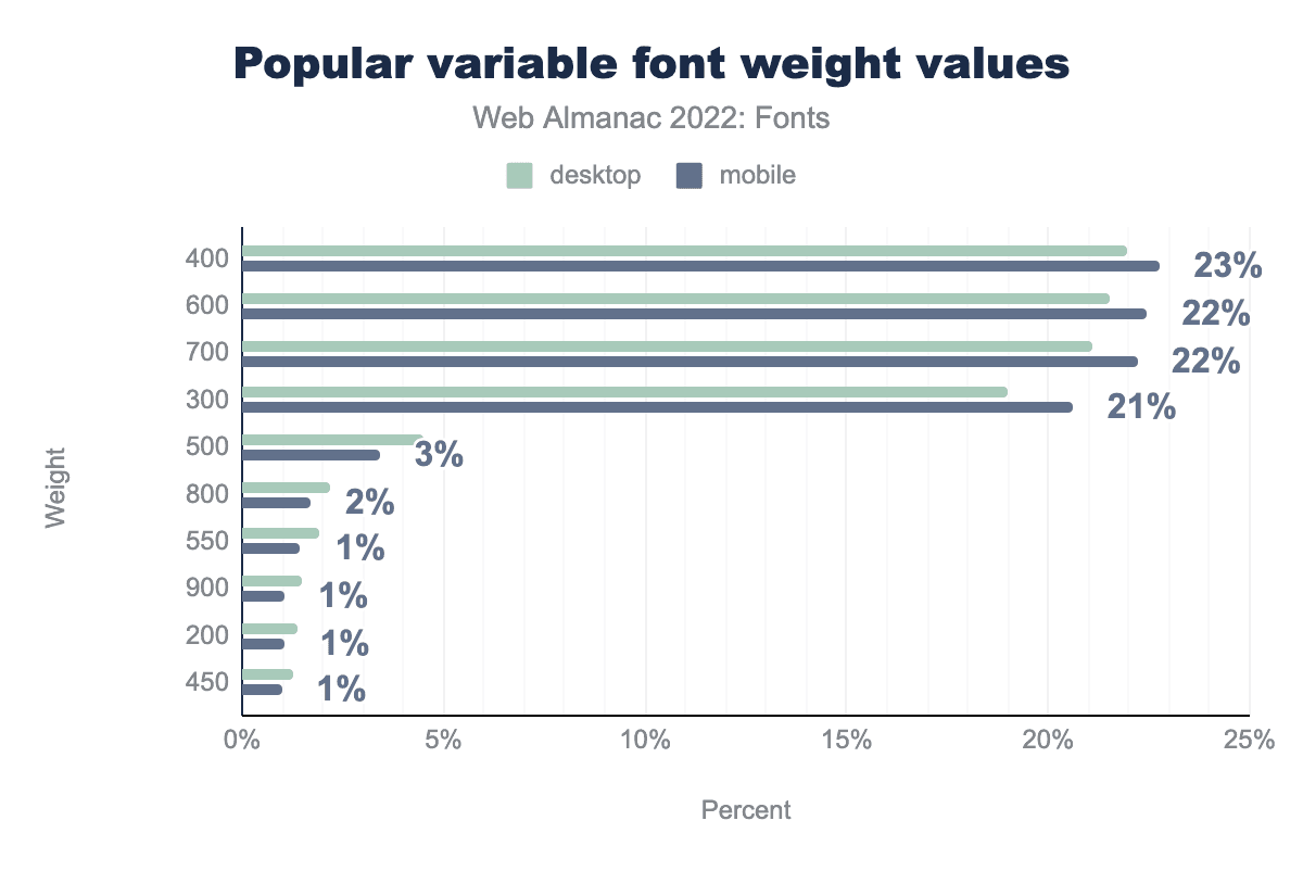 400 is used on 22% of desktop pages using variable fonts and 23% of mobile pages using variable fonts, 600 on 22% of both, 700 on 21% of desktop and 22% of mobile pages, 300 on 19% and 21% respectively, 500 on 4% and 3%, 800 on 2% of both pages, 550 on 2% of desktop and 1% of mobile pages, 900 on 1% of both, 200 on 1% of both, and finally 450 on 1% of both desktop and mobile pages.Even more puzzling is that the most popular weight axis values are the “default” CSS weight values that have been around since the early days of CSS! Only 16% of the weight values are custom values along the weight range.