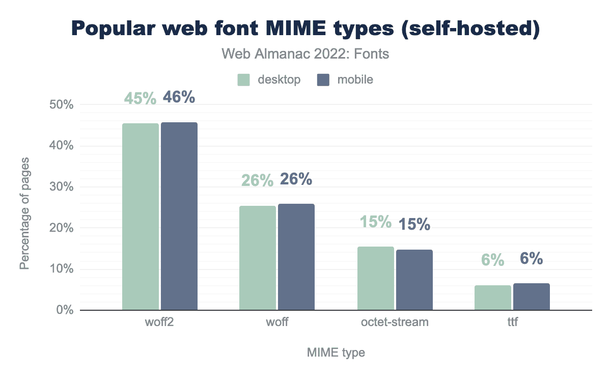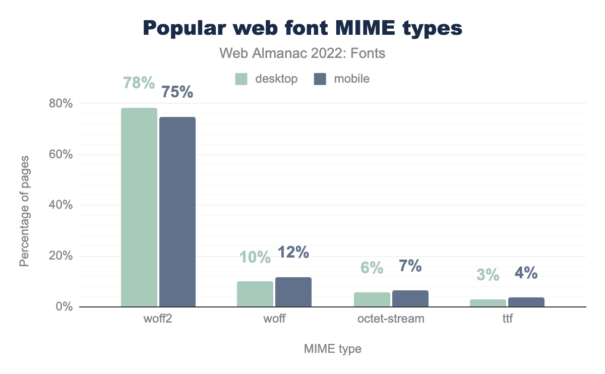 woff2 is used on 78% of the time on desktop and 75% on mobile, woff on 10% and 12% respectively, octet-stream on 6% and 7%, ttf on 3% and 4%, sfnt on 1% and 1%, otf on 0% and 0%, and finally opentype on 0% of desktop and 0% of mobile.Surprisingly, not a lot has changed in the types of fonts served. About 75% of all font files are served as WOFF2, about 12% as WOFF and the remainder as either octet-stream or TrueType Font—and then a whole bunch of random MIME types. This is fairly similar to the results in the 2020 Fonts chapter. Fortunately, SVG and EOT font usage has almost disappeared completely.