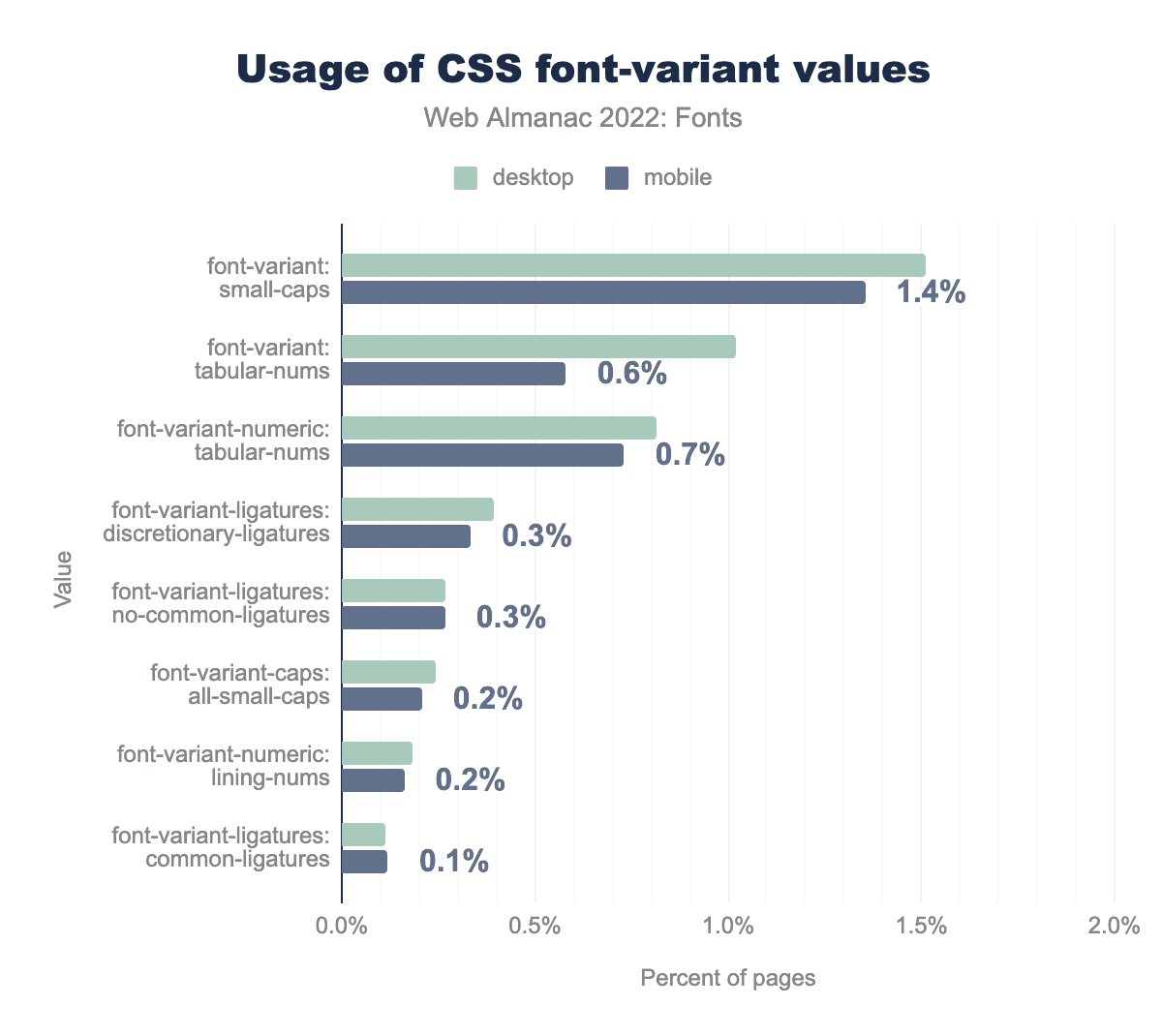 font-variant: small-caps is used on 1.5% of desktop pages and 1.4% of mobile pages, font-variant: tabular-nums on 1.0% and 0.6% respectively, font-variant-numeric: tabular-nums on 0.8% and 0.7%, font-variant-ligatures: discretionary-ligatures on 0.4% and 0.3%, font-variant-ligatures: no-common-ligatures on 0.3% and 0.3%, font-variant-caps: all-small-caps on 0.2% and 0.2%, font-variant-numeric: lining-nums on 0.2% and 0.2%, and finally font-variant-ligatures: common-ligatures on 0.1% of desktop and mobile pages.The most used font-variant value is small-caps at 1.4% of pages. This is surprising, because small caps are only supported by 0.7% of fonts. That means that most people using font-variant: small-caps and font-variant-caps will get faux small caps that are generated by the browser instead of small caps created by the type designer! In the future, you can avoid faux small caps by using the font-synthesis-small-caps property.