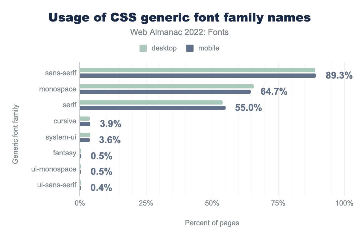 sans-serif is used on 89.1% of desktop pages and 89.3% of mobile pages, monospace on 65.8% and 64.7% respectively, serif on 54.0% and 55.0%, cursive on 3.7% and 3.9%, system-ui on 4.0% and 3.6%, fantasy on 0.5% and 0.5%, ui-monospace on 0.6% and 0.5%, and finally ui-sans-serif is used on 0.5% of desktop and 0.4% of mobiles pages.While these are fairly new, they are already seeing significant use. The usual suspects, sans-serif, monospace, and serif obviously take the lead as they have been around since the first version of the CSS specification.