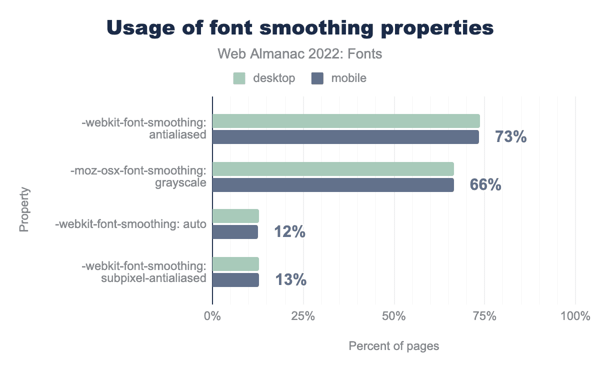 -webkit-font-smoothing: antialiased is used on 74% of desktop and 73% of mobile pages, -moz-osx-font-smoothing: grayscale on 67% and 66%, -webkit-font-smoothing: auto on 13% and 12%, and finally -webkit-font-smoothing: subpixel-antialiased is used on 13% of desktop and 13% of mobile pages.And now for a complete surprise—to us anyway: people really like to specify their MacOS-only font smoothing preferences. For example, the -webkit-font-smoothing: antialiased value is used on 73.4% of all sites. This is surprising because it—and its siblings -mox-osx-font-smoothing, and font-smoothing—are not even official CSS properties. This might make them the most used unofficial CSS properties!