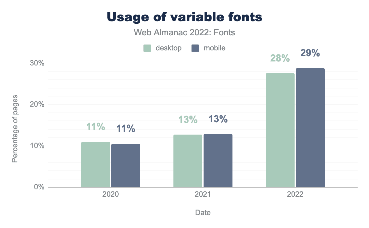 Usage of variable fonts has nearly tripled since the last measurement in the Almanac’s 2020 Fonts chapter! Nearly 29% of websites use variable fonts. Most of this growth seems to have happened in the last year, with an amazing 125% growth.