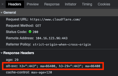 For example, in September 2022, the alt-svc value in the response for https://www.cloudflare.com is h3=":443"; ma=86400, h3-29=":443"; ma=86400 as shown in the screenshot below. h3 and h3-29 tell us that Cloudflare supports HTTP/3 and IETF draft 29 of HTTP/3 over UDP port 443. There is also a proposal to speed up the discovery of HTTP/3 as part of DNS lookup; for more details see this post from Cloudflare.