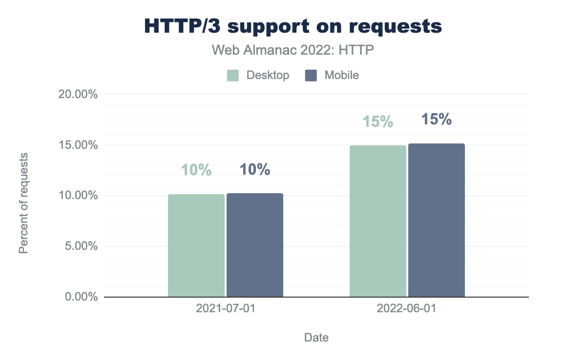 The figure above shows that there is a 5 percentage point increase, from 10% to 15%, in the percentage of requests with HTTP/3 support since last year’s Web Almanac. The same increase was observed on both desktop and mobile requests.