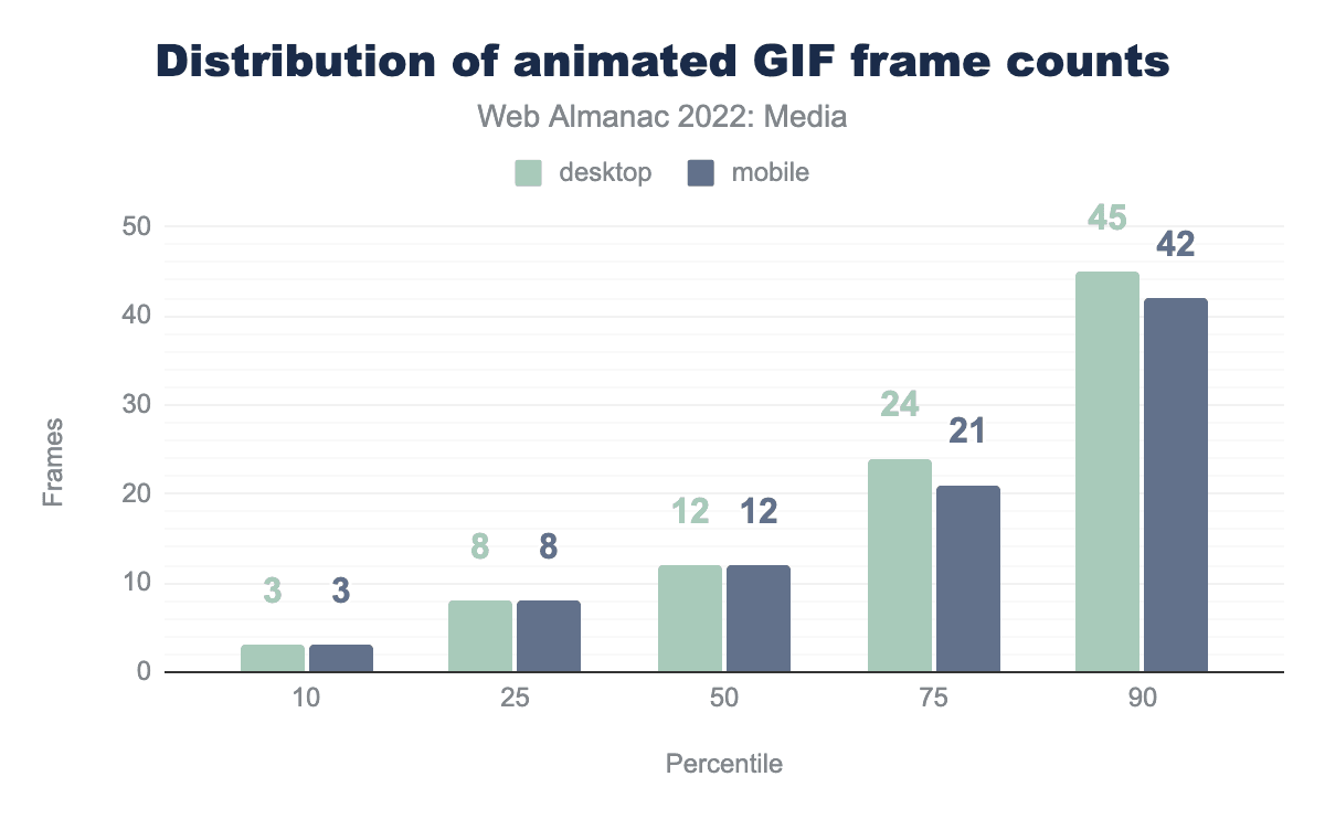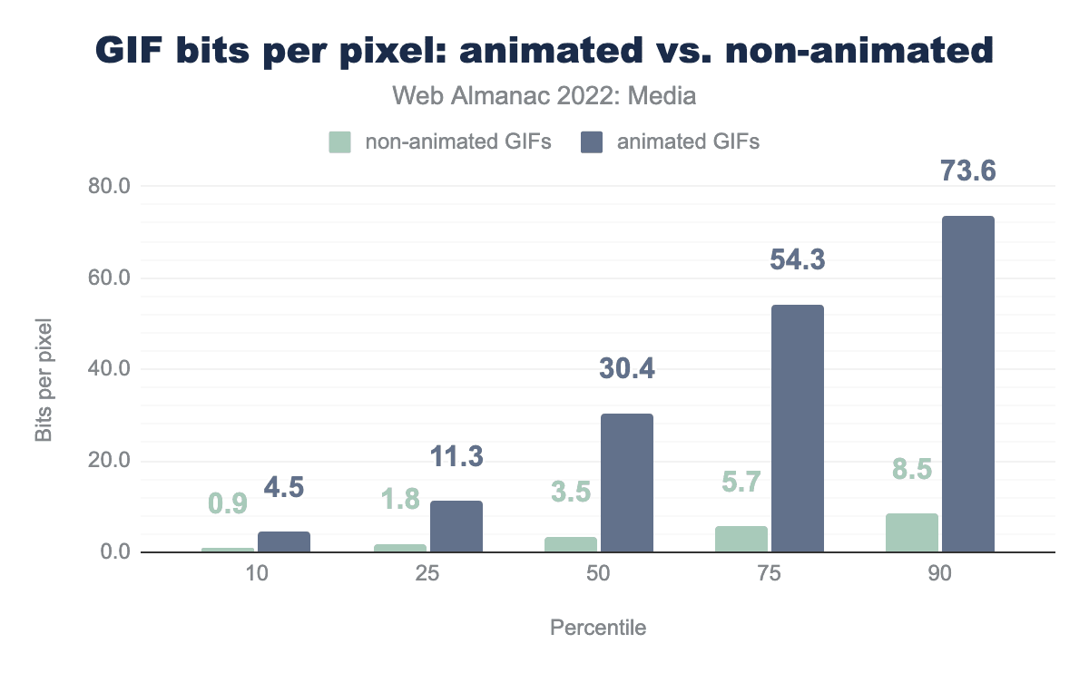 I found this surprisingly low. Ever since PNG achieved universal support in 2006, there hasn’t been a good reason to ship a non-animated GIF. The word “GIF” has become synonymous with its only justifiable use case: Being a portable, universal format for short, silent, autoplaying, looping animation. One wonders whether all of these non-animated GIFs are legacy content, or whether there are a significant number of new, non-animated GIFs being created and published to the web—I hope not!