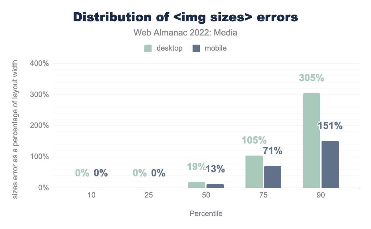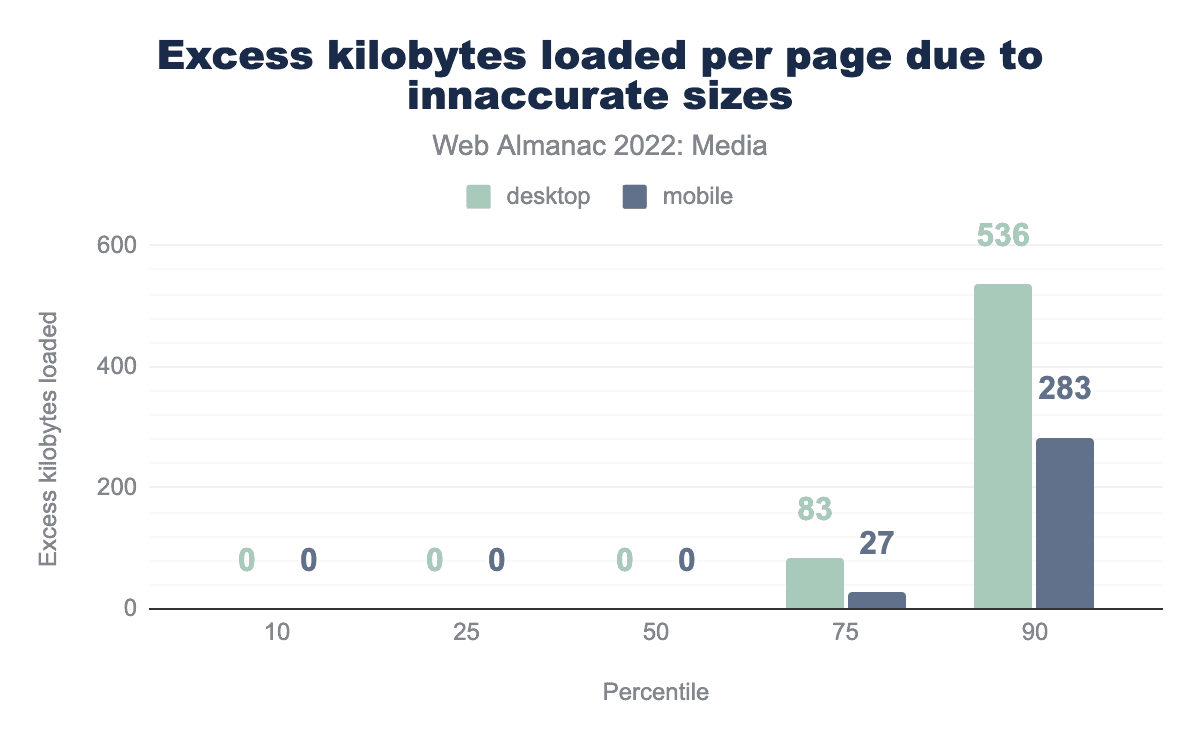 We estimate that one-quarter of desktop pages are loading more than 83 KB of extra image data, based purely on bad sizes attributes. That is to say: A better, smaller resource is there for the picking in the srcset, but because the sizes attribute is so erroneous, the browser doesn’t pick it. Additionally, 10% of desktop pages that use sizes load more than a half-megabyte of excess image data because of bad sizes attributes!