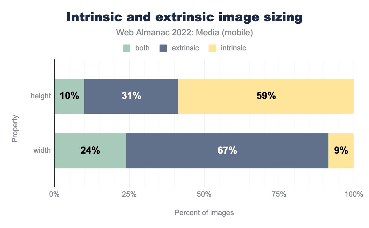 The majority of images have extrinsic widths; the majority of images have intrinsic heights. The “both” category for width—representing images with either a max-width or min-width sizing constraint—is also fairly popular. Leaving images to their intrinsic widths is far less popular—and slightly less popular than it was last year.