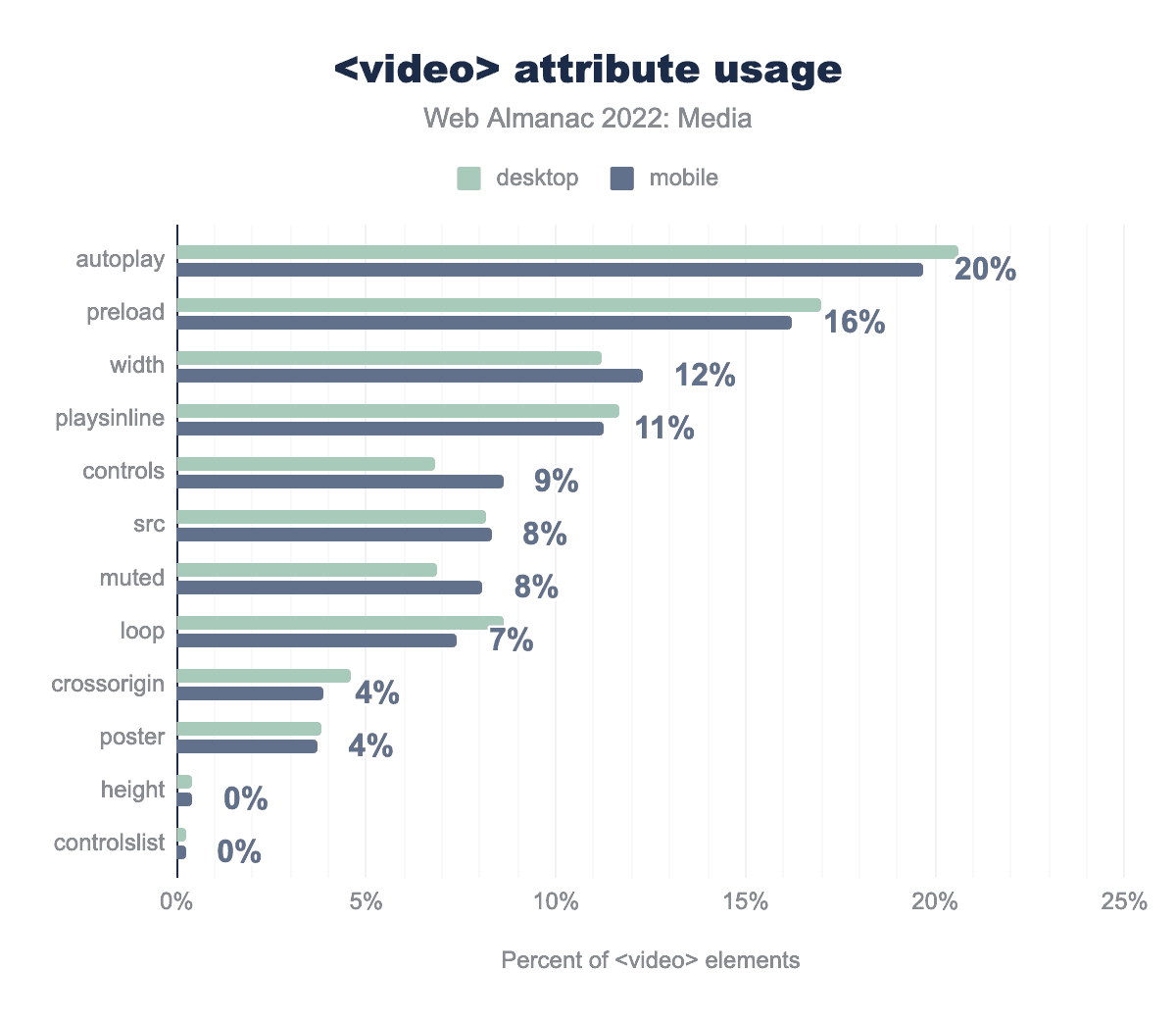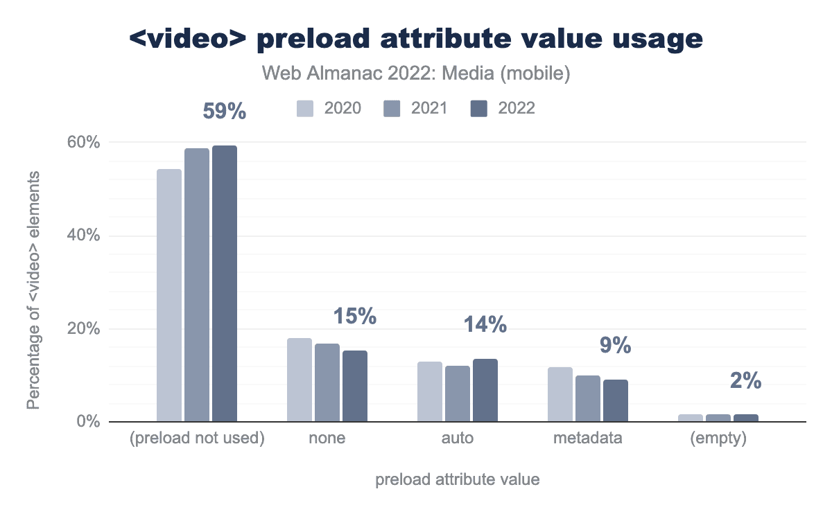 Different browsers do different things when it comes to deciding when to load video data. The preload attribute is a way for authors to step in and have more control over that process. That could include explicitly asking the browser not to preload anything with none; asking the browser to preload just the metadata; or asking the browser to preload, using either the auto or empty values. It’s interesting, and perhaps heartening, to see authors exert less control over video loading during the past three years. Browsers know the most about their users’ contexts; not including the preload attribute at all lets them do what they think is best.