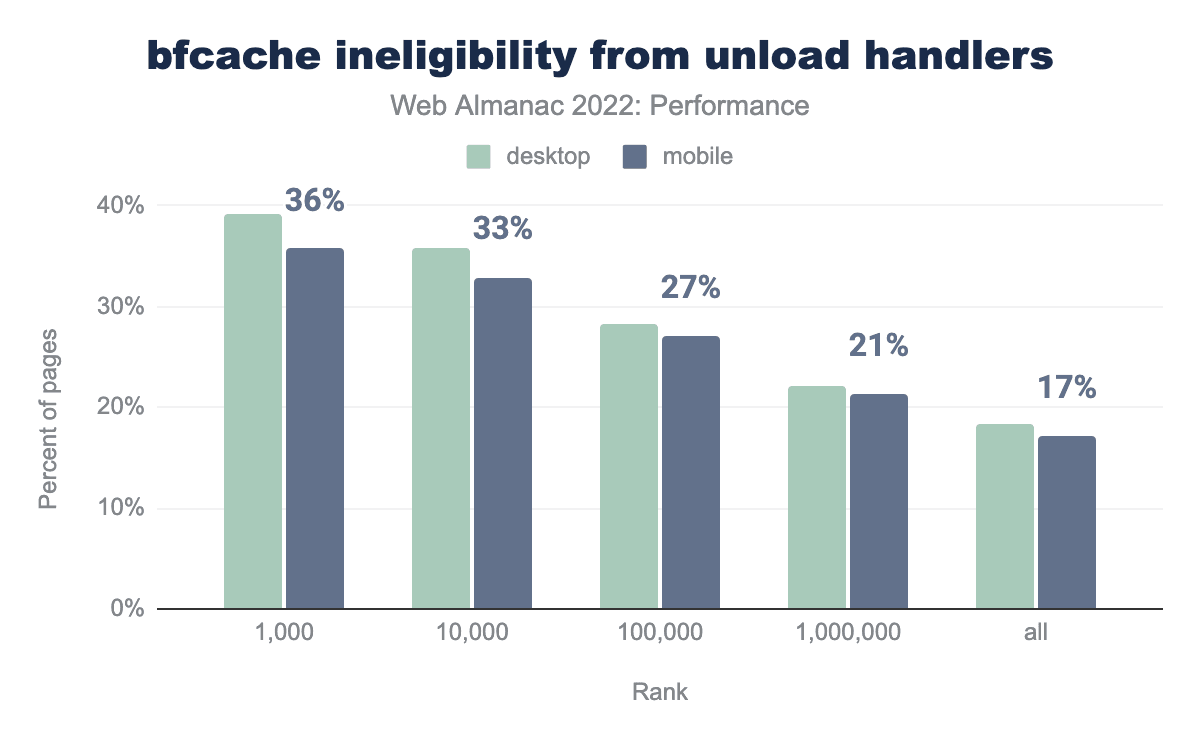 The cause of this improvement seems to come down to Chrome’s launch of bfcache, which is reflected in the January 2022 CrUX dataset. However, at least a fifth of sites are ineligible for this feature due to aggressive no-store caching policies or discouraged use of the unload event listener. Correcting these anti-patterns is CLS’s “one weird trick” to improve performance.
