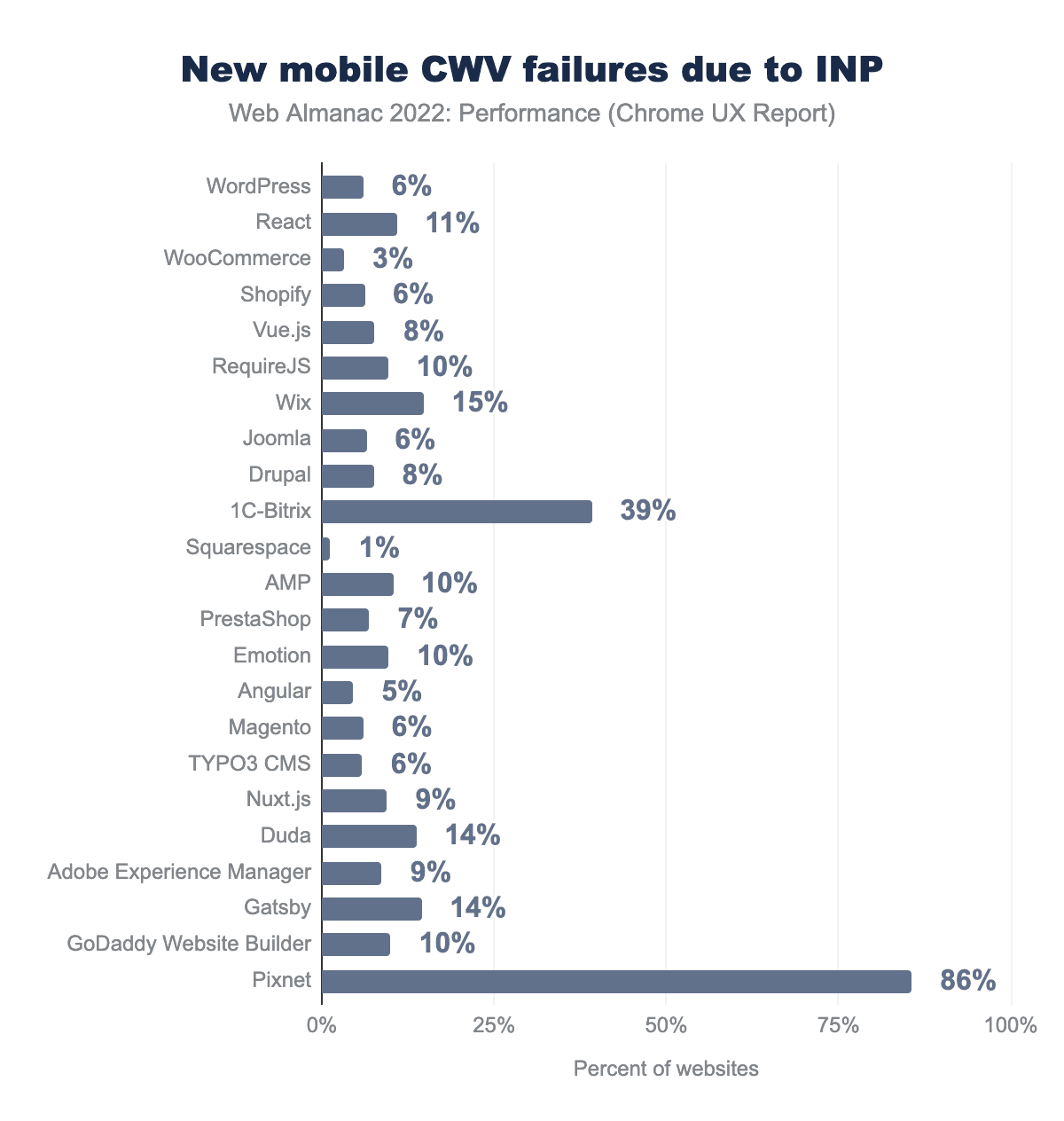 11% of websites using the React framework would no longer pass CWV. Wix, which is now the second most popular CMS, uses React. 15% of its websites would not have “good” CWV. Proportionally though, there would still be more Wix websites passing CWV than React websites overall, at 24% and 19% respectively, but INP would narrow that gap.
