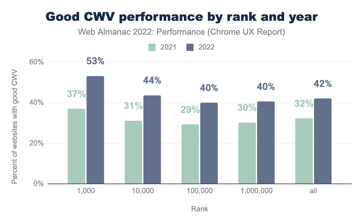 We segmented sites by their relative popularity (rank) and year, without distinguishing between desktop and mobile. What’s interesting is that it seems websites across the board generally got more performant this year, regardless of their popularity. The top 1,000 most popular websites improved most significantly, a 16 percentage point increase to 53%, with all ranks improving by 10 points or more. The most popular websites also tend to have the best CWV experience, which is not too surprising if we assume that they have bigger engineering teams and budgets.