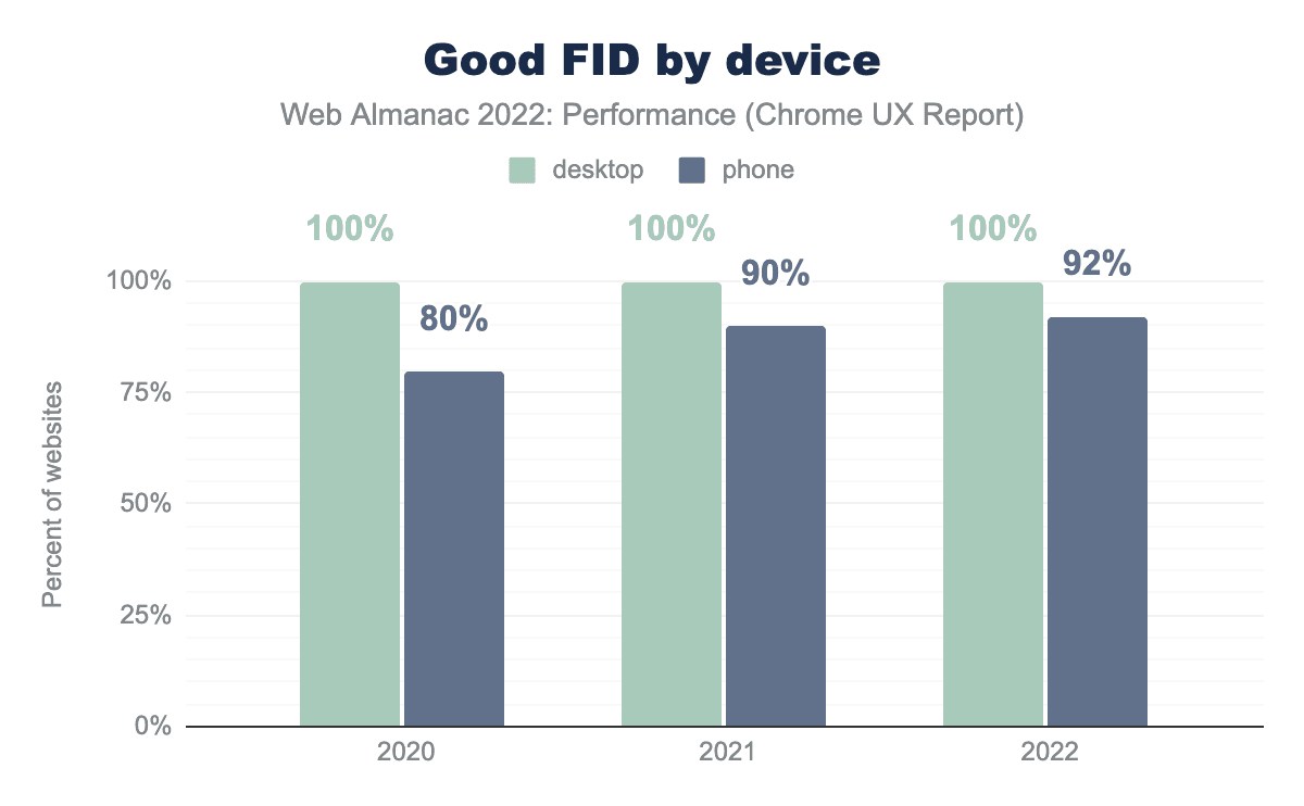 Effectively all websites have “good” FID for desktop users, and this trend has held firm over the years. Mobile FID performance is also exceptionally fast, with 92% of websites having “good” FID, a slight improvement over last year.