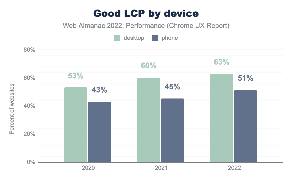 This year, 51% of websites have good LCP experiences on mobile and 63% on desktop. LCP appears to be one of the major reasons why websites’ mobile experiences have gotten so much better in 2022, having a 6 percentage point improvement this year.