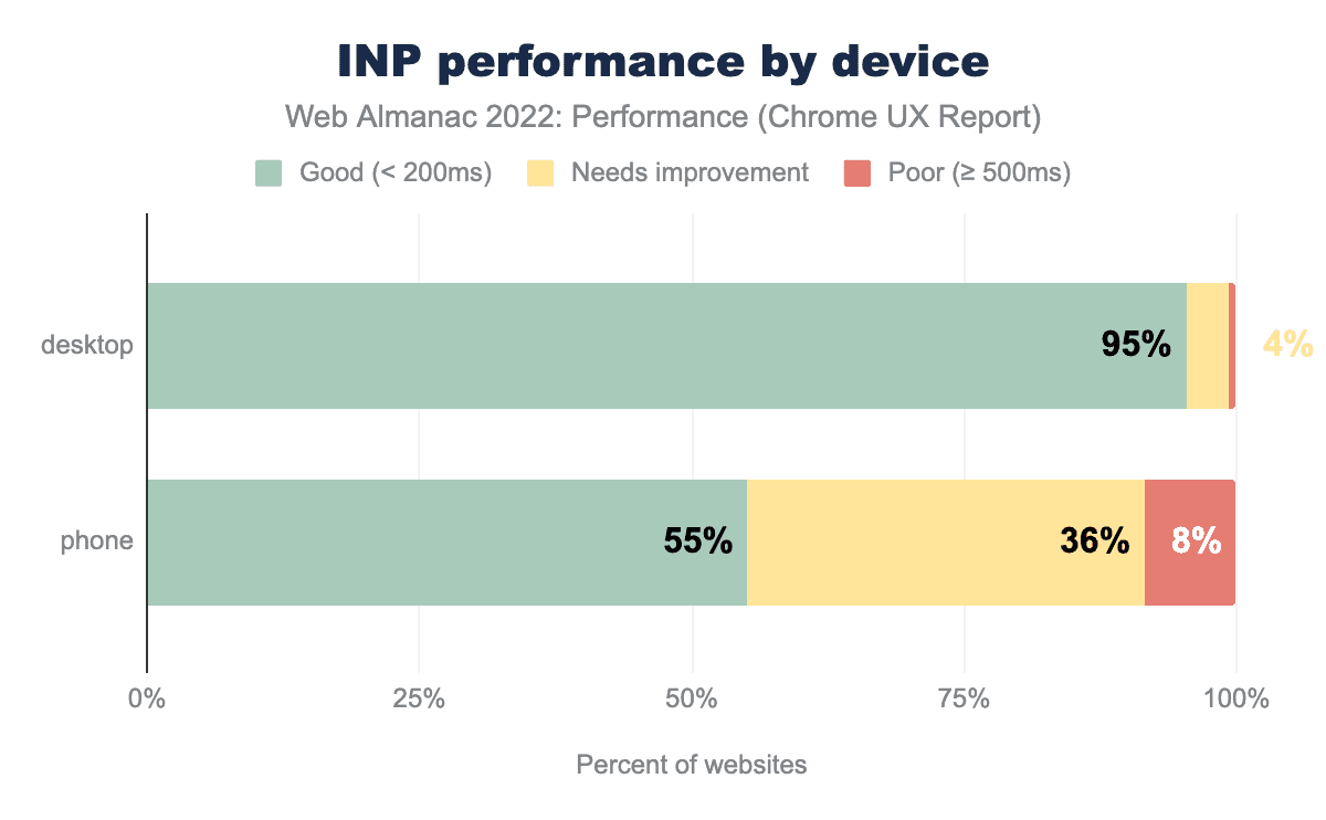55% of websites have “good” INP on mobile, 36% are rated “needs improvement”, and 8% have “poor” INP. The desktop story of INP is more similar to FID in that 95% of websites are rated “good”, 4% are rated “needs improvement”, and 1% are “poor”.