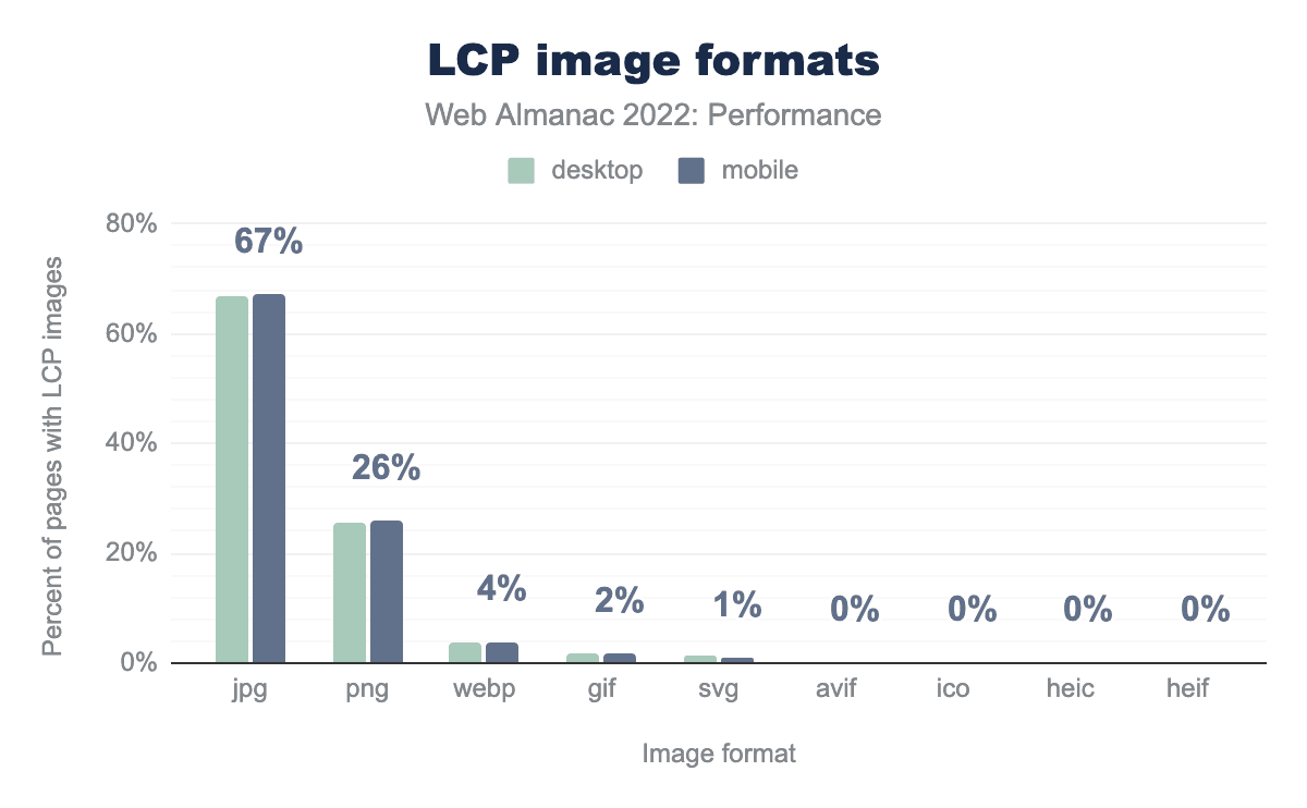 Note that the percentages in this section are out of only those pages in which the img element is the LCP, not all pages. For reference, recall that this accounts for 42% of pages.