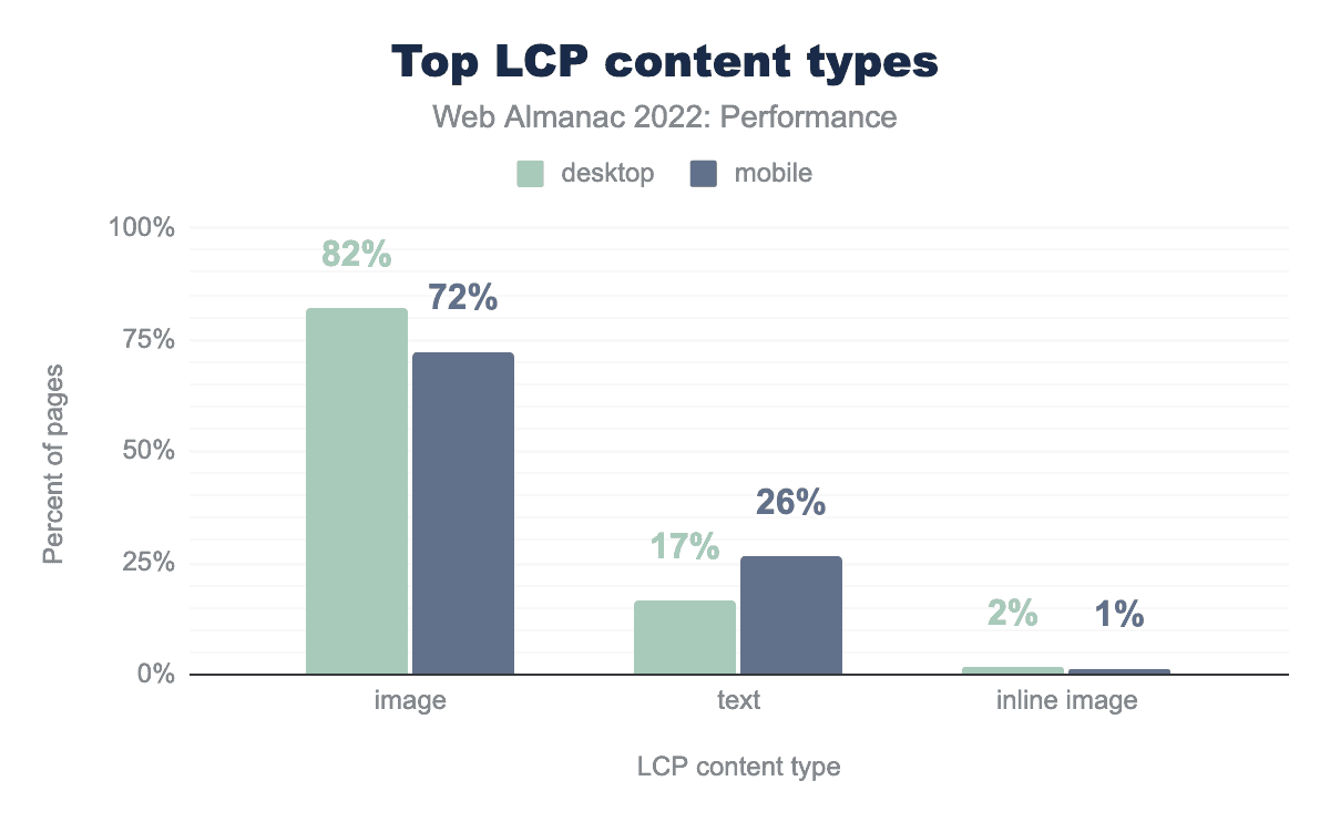 We see that 72% of mobile pages and 82% of desktop pages have images as their LCP. For example, these images may be traditional img elements or CSS background images. This suggests that the vast majority of the div elements seen in the previous figure are images as well. 26% of mobile pages and 17% of desktop pages have text-based content as their LCP.