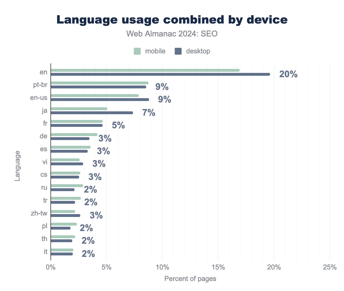 The use of hreflang tags on inner pages has x-default (7.3%) and en (English, 7.1%) as the most common values. When the values are broken down between mobile and desktop, we get 8.0% for desktop and 7.3% for mobile for x-default, and 8.0% for desktop and 7.1% for mobile for en.