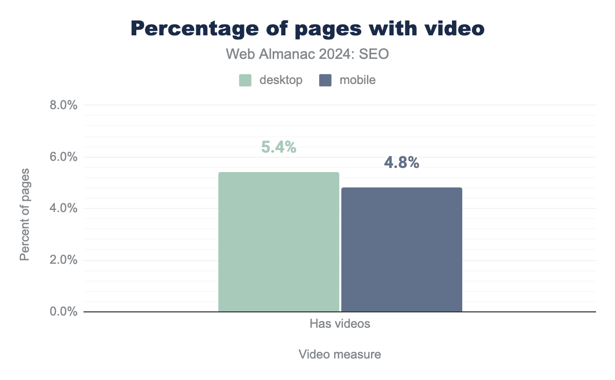 Overall usage of structured data grew in 2024 to 49% of mobile home pages and 48% of desktop home pages. This was a slight increase from 2022 when 47% of crawled mobile home pages and 46% of crawled desktop home pages had structured data.