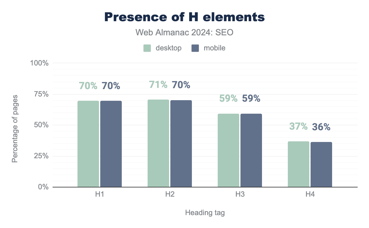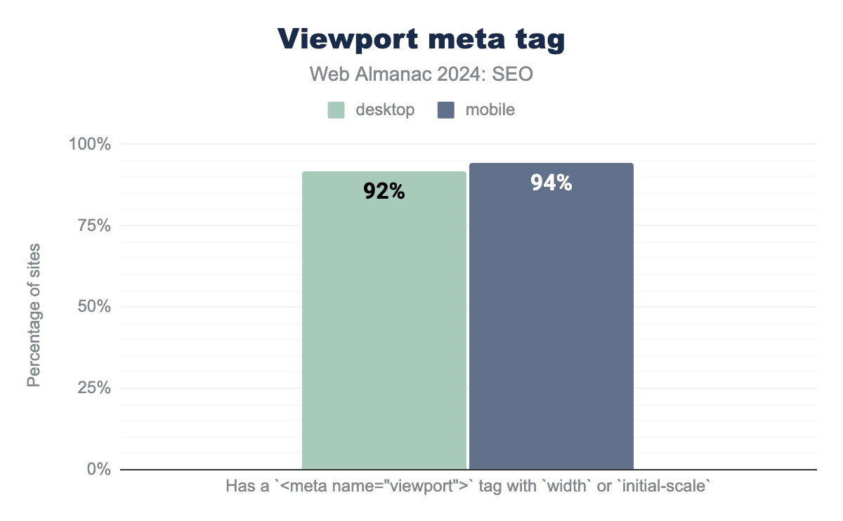 In 2024, 10.9% of mobile pages had <head> breaking invalid HTML elements. That represented a 12% decrease from 2022’s rate of 12.6%. Meanwhile, desktop pages with invalid HTML in the <head> decreased from 12.7% in 2022 to 10.6% in 2024.