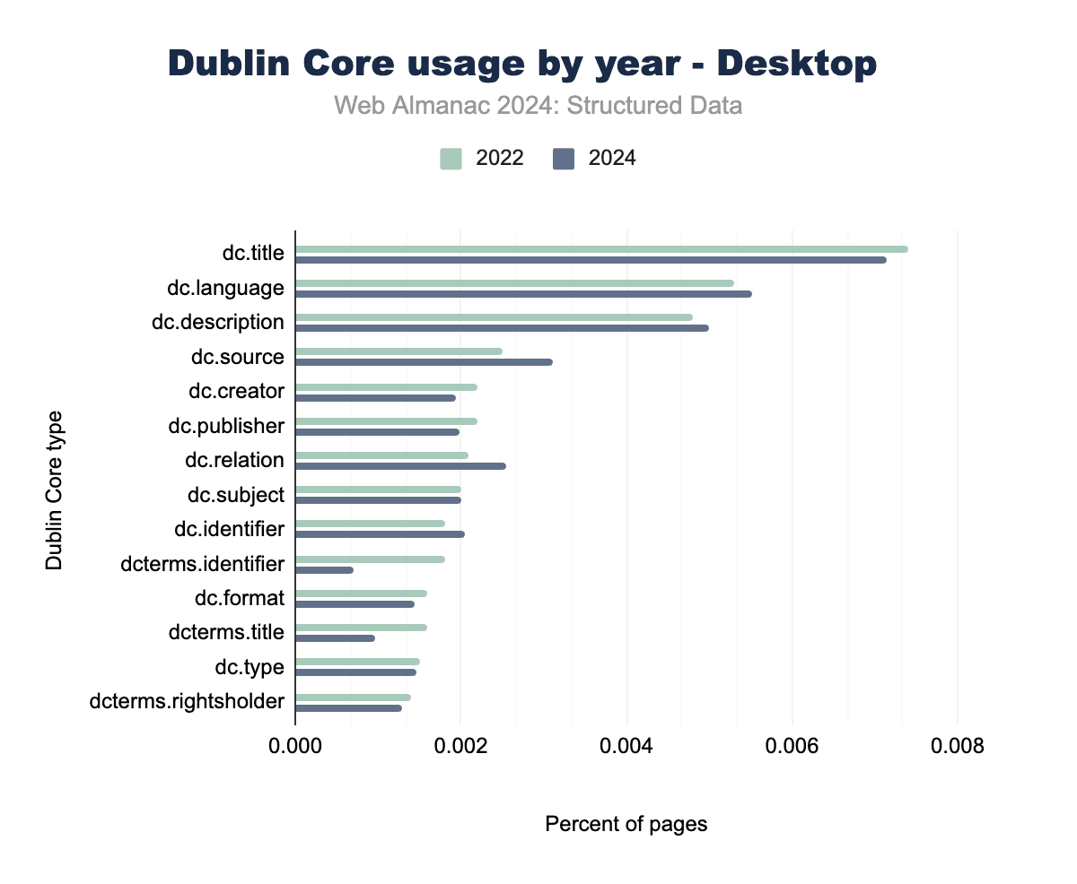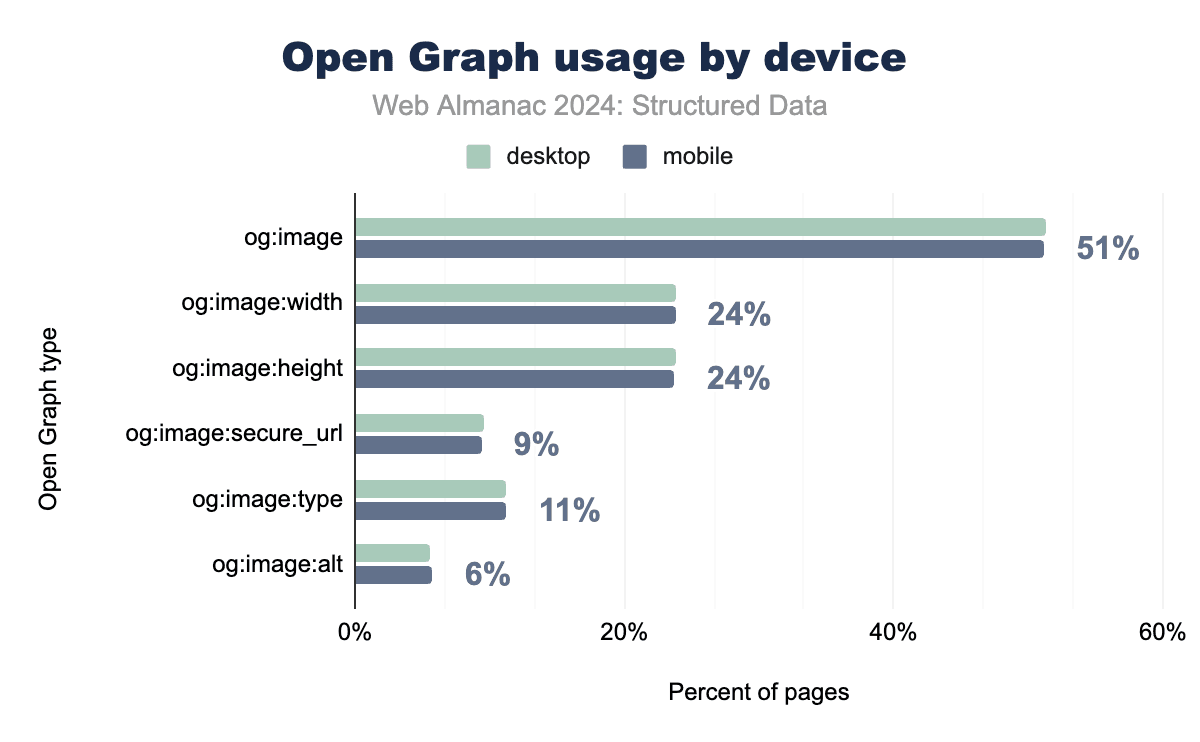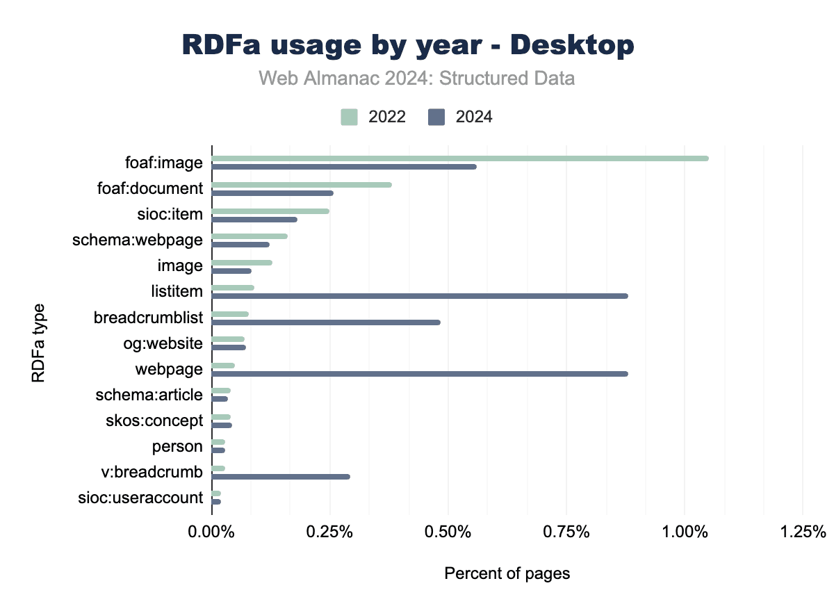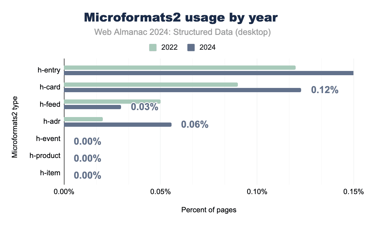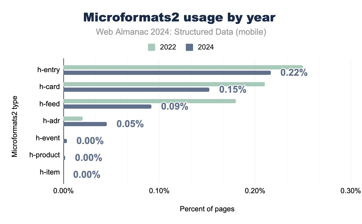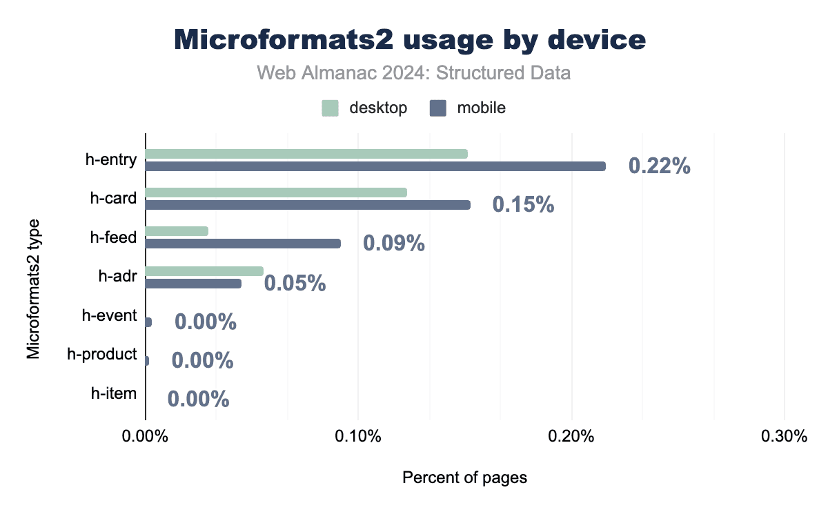 Microformats2, while still relatively niche, has seen slightly higher adoption than its predecessor. Tags like h-entry and h-card, which are used for blogging and personal identity data, now appear on 0.22% of mobile pages and 0.15% of desktop pages. These tags continue to serve specific needs, particularly for address data and simple content structures.